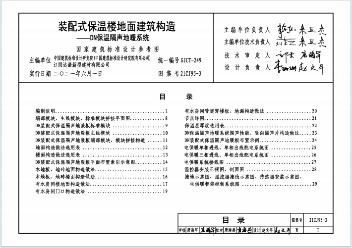 21CJ95-3《装配式保温楼地面建筑构造-DN保温隔声地暖系统》国家建筑标准设计参考图集,2021 年 6 月 1 日实行,适用于采用加热电缆地面辐射供暖系统的新建、改建及扩建居住建筑和一般公共建筑,核心内容如下: