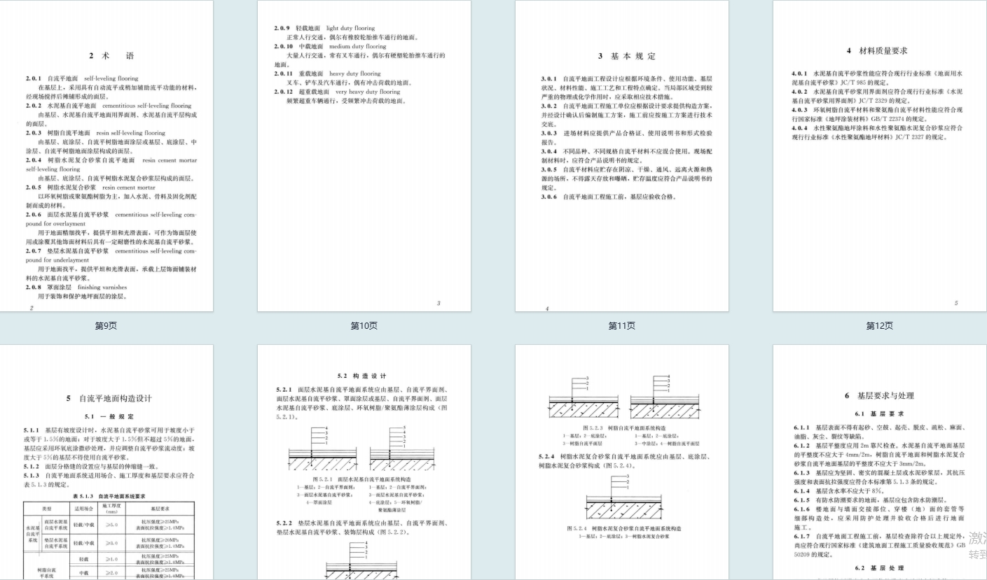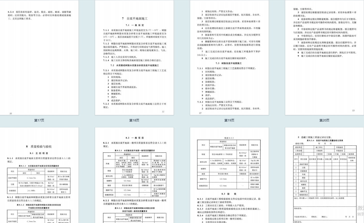 JGJ/T175-2018《自流平地面工程技术标准》百度网盘PDF电子版下载 3小时前 BIM资料 7 推广 JGJ/T 175-2018《自流平地面工程技术标准》,该标准为行业标准,2018 年 10 月 1 日实施,替代原 JGJ/T 175-2009,适用于建筑室内自流平地面工程的设计、施工及验收,核心内容如下: 1. 基本规定与分类 自流平地面分为三类:水泥基自流平地面、树脂自流平地面、树脂水泥复合砂浆自流平地面,按使用荷载分为轻载、中载、重载、超重载地面。 设计需结合环境条件、使用功能、基层状况等确定,施工前应编制方案并技术交底,不同品种、规格的自流平材料不得混合使用。 材料需贮存在阴凉干燥、远离火源热源的场所,进场时应提供产品合格证、使用说明书及形式检验报告。 2. 材料与构造设计 (1)材料质量要求 水泥基自流平砂浆性能符合《地面用水泥基自流平砂浆》JC/T 985,其界面剂符合《水泥基自流平砂浆用界面剂》JC/T 2329。 树脂类材料(环氧、聚氨酯)符合《地坪涂装材料》GB/T 22374,水性聚氨酯类符合《水性聚氨酯地坪材料》JC/T 2327。 (2)构造设计 水泥基自流平地面:面层型由基层、界面剂、自流平砂浆及罩面 / 薄涂层构成;垫层型增设装饰层。 树脂自流平地面:由基层、底涂层(可加中涂层)、自流平面层构成。 树脂水泥复合砂浆自流平地面:由基层、底涂层、复合砂浆层构成。 3. 基层要求与处理 (1)基层要求 基层需坚固密实,无起砂、空鼓、裂缝等缺陷,抗压强度和表面抗拉强度符合规定,含水率≤8%。 平整度要求:水泥基自流平地面基层≤4mm/2m,树脂类及复合类≤3mm/2m。 有防水防潮要求的地面需设防水防潮层,楼地面与墙面交接处需防护处理。 (2)基层处理 强度不达标时需补强或重新施工;裂缝采用切割后灌注修补;空鼓面积≤1m² 可灌浆处理,>1m² 需剔除重施工。 基层凸起需打磨,凹陷用树脂砂浆找平,确保表面平整清洁。 4. 施工要点 (1)施工环境 水泥基自流平施工温度宜 5℃~30℃,树脂类及复合类宜 10℃~30℃,基层表面温度≥5℃,相对湿度≤80%。 树脂类施工时需通风、严禁烟火,避免交叉作业和杂物污染。 (2)施工流程与要求 水泥基 / 复合砂浆类:封闭现场→基层检查处理→涂刷界面剂 / 底涂→制备摊铺浆料→消泡→养护(≥24h)→成品保护。 树脂类:封闭现场→基层检查处理→涂刷底涂→批刮中涂→修补打磨→摊铺面涂→消泡→养护→成品保护。 浆料需充分搅拌均匀,摊铺后必要时用消泡滚筒处理,施工期间严禁扰动。 5. 质量检验与验收 (1)主控项目 表面平整度:水泥基面层≤3mm/2m,树脂类及复合类≤3mm/2m。 空鼓:每 20m² 不超过 2 处,单处面积≤400cm²。 拉拔强度:水泥基≥1.0MPa,树脂类及复合类≥2.0MPa 或基层破坏。 (2)一般项目 外观需平整密实,无裂纹、针孔、色差等缺陷,厚度符合设计要求。 耐冲击性:1kg 钢球自由落体无裂纹剥落;耐磨性≤0.6mm,坡度符合设计要求。 检验批按面积划分,主控项目全部合格,一般项目合格率≥80% 且不影响使用,验收需提供完整施工及质量记录。 资源下载下载价格6.00 元VIP免费升级VIP立即购买本站资源来源于用户上传,版权归原作者所有,本站只收取管理维护费用,若您的权益受到侵害,请尽快 发起投诉大小:8.96MB格式:pdf版权:仅供学习,请勿商用解压密码:www.bimzyw.com 声明:本站资源全部来自公开网络购买或收集,水印不代表署名仅用于防盗,版权归原作者所有。 版权说明:资源均源于互联网收集整理,不保证资源的可用及完整性,仅供个人学习研究,请勿商用。喜欢记得支持正版,若侵犯第三方权益,请及时联系我们删除!《版权声明》 0 0