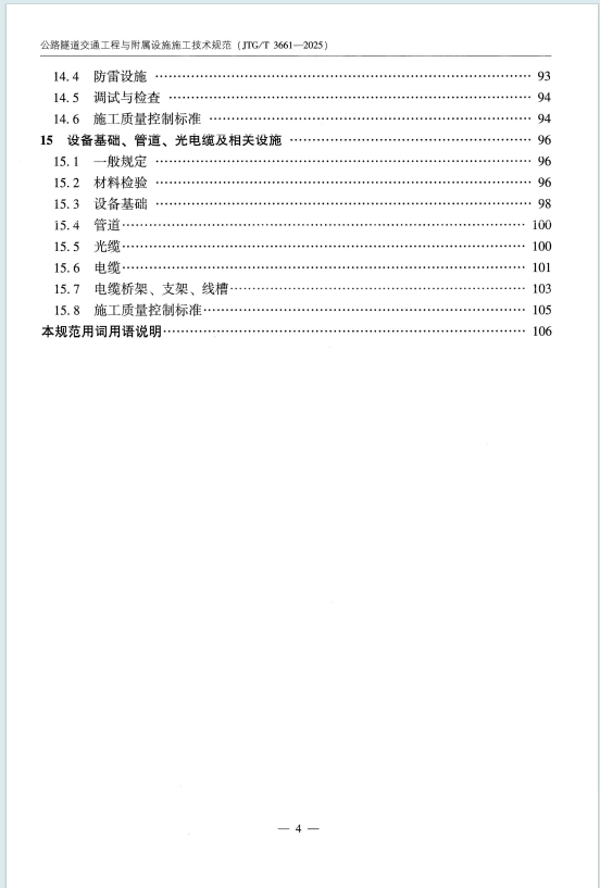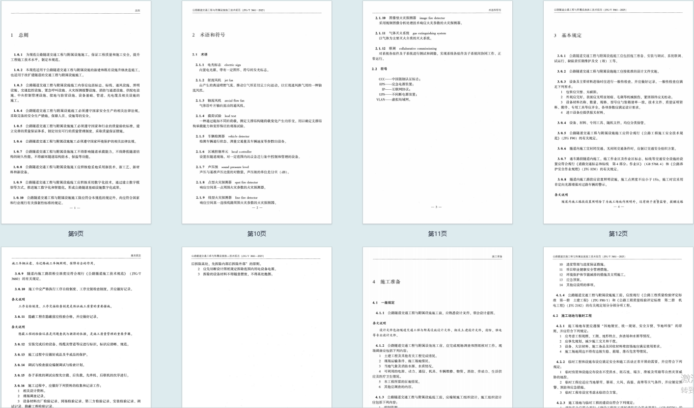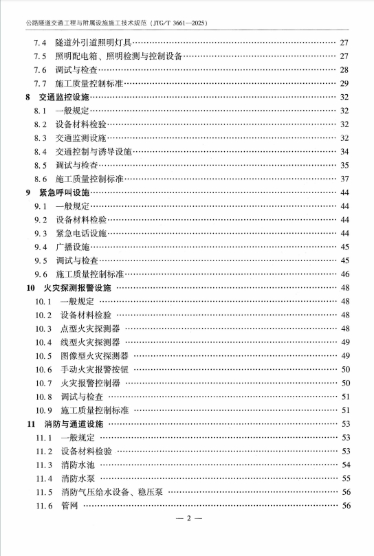 JTG/T3661-2025《公路隧道交通工程与附属设施施工技术规范》百度网盘PDF电子版下载 2小时前 BIM资料 7 推广 JTG/T 3661-2025《公路隧道交通工程与附属设施施工技术规范》,该规范为公路工程推荐性行业标准,2025 年 4 月 1 日实施,替代原 JTG/T F72-2011,适用于公路隧道交通工程与附属设施的新建、升级改造及改扩建施工,核心内容如下: 1. 基本规定与施工准备 核心原则:遵循 “以人为本、安全环保、规范施工、科学管理、全周期优质”,施工不得影响隧道承载能力、结构耐久性及防水保温功能。 施工流程:涵盖施工准备、安装调试、系统联调、试运行、缺陷责任期维护及交(竣)工等阶段,强调工序自检、交接检查及隐蔽工程验收制度。 施工准备:需完成设计文件熟悉、现场调查、施工组织设计编制,明确施工场地布置、人员设备配置及工程交接要求,特种作业人员需持证上岗。 2. 核心设施施工要求 (1)基础类设施 标志标线:含隧道内外标志、标线、轮廓标 / 带,电光标志需保证亮度与接地可靠,标线施工需在路面清洁干燥时进行,厚度与逆反射系数符合要求。 设备基础与管道:基础位置、高程、尺寸需满足设计,混凝土强度达标;管道敷设需保证通畅,金属管道防腐与接地符合规定,硅芯管弯曲半径不小于外径 15 倍。 光电缆:光缆曲率半径不小于外径 20 倍,接头损耗单模≤0.1dB、多模≤0.08dB;电缆需强弱分离敷设,弯曲半径、绝缘电阻符合对应类型要求,严禁导管内接头。 (2)功能类设施 通风照明:射流风机、轴流风机需保证安装精度与接地,通风系统需具备手动 / 自动控制及远程联动功能;照明灯具安装偏差横向≤20mm、纵向≤30mm,路面亮度均匀度及应急照明切换符合要求。 交通监控与紧急呼叫:摄像机、车辆检测器需保证视场覆盖与数据准确,可变信息标志亮度及视认距离达标;紧急电话分机音量≥90dB (A),广播扬声器正前方 1m 处音量≥110dB (A),呼叫响应灵敏。 消防与通道:消防水池、水泵、管网需试压合格(强度试验稳压 30min 无泄漏),消火栓竖直安装偏差≤1%;人行横通道防火门启闭灵活无门槛,车行横通道防火卷帘导轨平行度偏差≤5mm。 供配电与接地防雷:高低压配电柜安装偏差、通道宽度符合规定,柴油发电机组切换时间及供电稳定性达标;接地电阻保护接地≤4Ω、防雷接地≤10Ω,共用接地≤1Ω,电涌保护器接线短直可靠。 (3)中央控制管理: 含控制台、机柜、大屏幕显示系统及软件安装,机柜布局需预留散热与维修空间,大屏幕拼接缝≤2mm(无设计要求时)。 软件需具备信息采集、数据处理、控制执行、应急预案等功能,系统联调需验证各子系统远程控制与联动响应准确性。 3. 质量控制与验收 通用要求:主控项目需全部合格,一般项目合格率≥80% 且不影响使用,设备材料进场需提供合格证、检验报告,强制性认证产品需具备对应标识。 专项标准:各设施施工均明确质量控制指标,如风机支架载荷试验为重力 15 倍、消防管网压力降≤0.05MPa、光电缆绝缘电阻达标等。 验收资料:需提供施工记录、调试报告、隐蔽工程记录、设备合格证等完整资料,系统需连续无故障运行达标时长(如火灾报警系统 120h)。 资源下载下载价格8.00 元VIP免费升级VIP立即购买本站资源来源于用户上传,版权归原作者所有,本站只收取管理维护费用,若您的权益受到侵害,请尽快 发起投诉大小:65.53MB格式:pdf版权:仅供学习,请勿商用解压密码:www.bimzyw.com 声明:本站资源全部来自公开网络购买或收集,水印不代表署名仅用于防盗,版权归原作者所有。 版权说明:资源均源于互联网收集整理,不保证资源的可用及完整性,仅供个人学习研究,请勿商用。喜欢记得支持正版,若侵犯第三方权益,请及时联系我们删除!《版权声明》 0 0