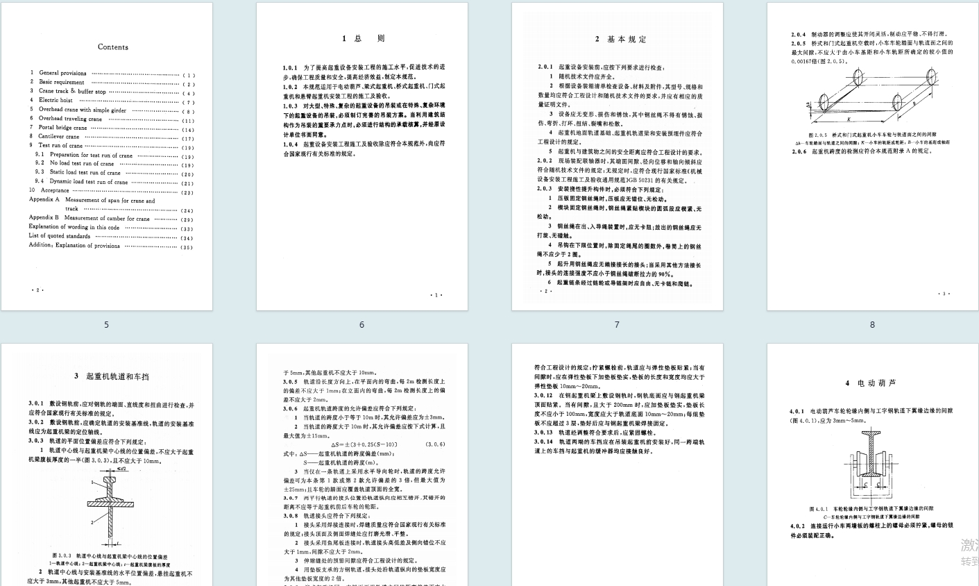 - 适用范围与结构:共 10 章 2 个附录,涵盖轨道、各类起重机安装、试运转及工程验收,新增电动葫芦门式起重机等相关技术规定,删除淘汰的冶金起重机内容。