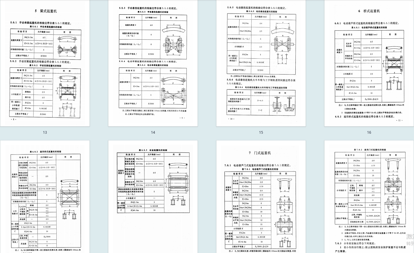 - 轨道与设备安装:轨道的平面位置、标高、跨度偏差等有严格限值,不同类型起重机(梁式、桥式等)的跨度、对角线、主梁弯曲等安装允许偏差分情况明确,部分条款为强制性条文。