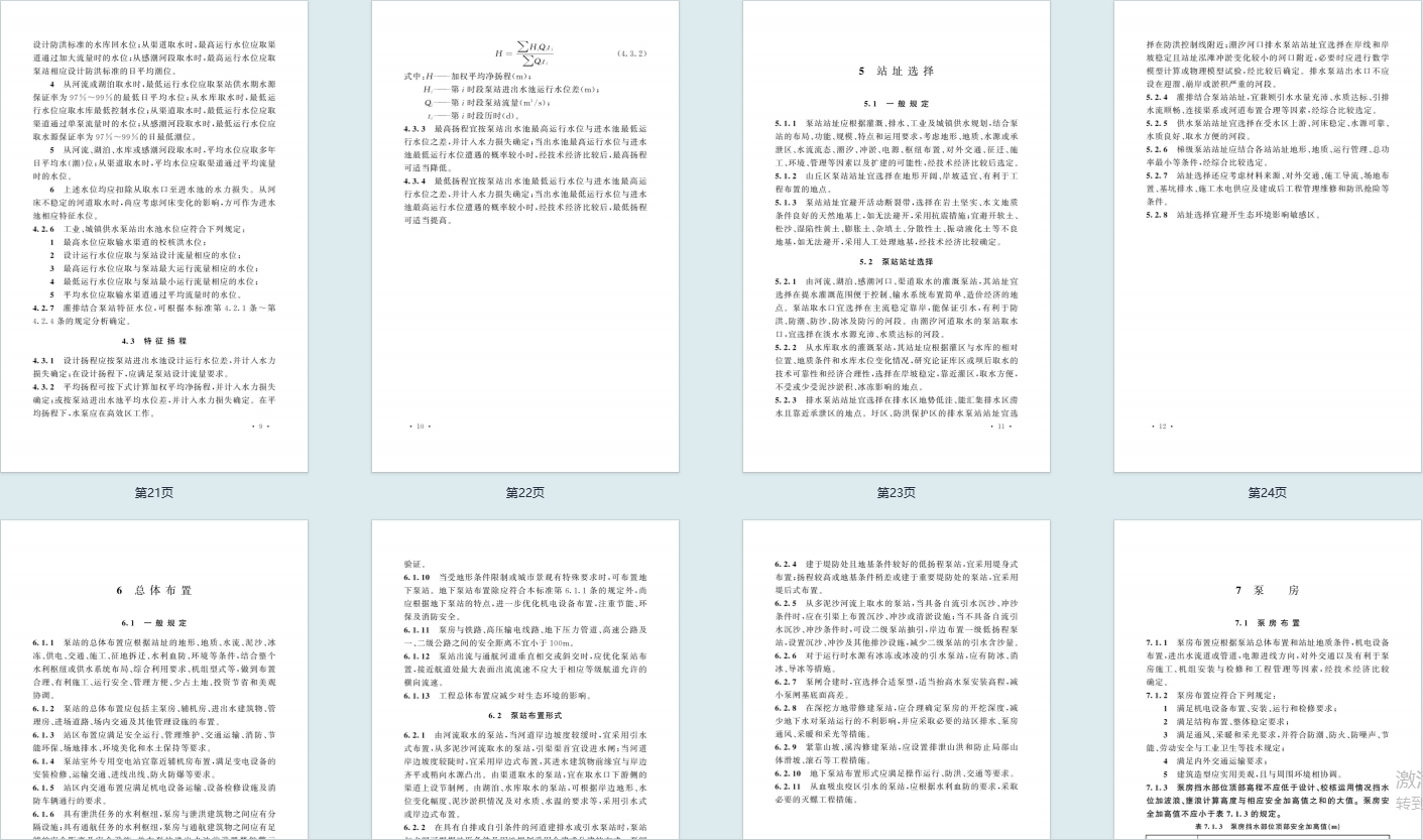 - 选址与布置:规定站址选择需考虑地形、地质、水源等因素,总体布置包含泵房、进出水建筑物等核心设施的布置原则。