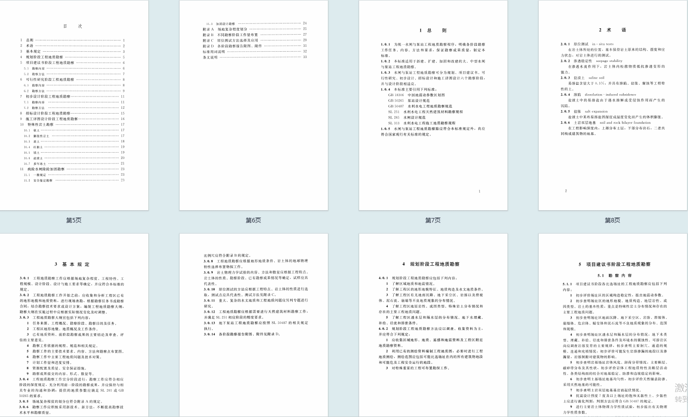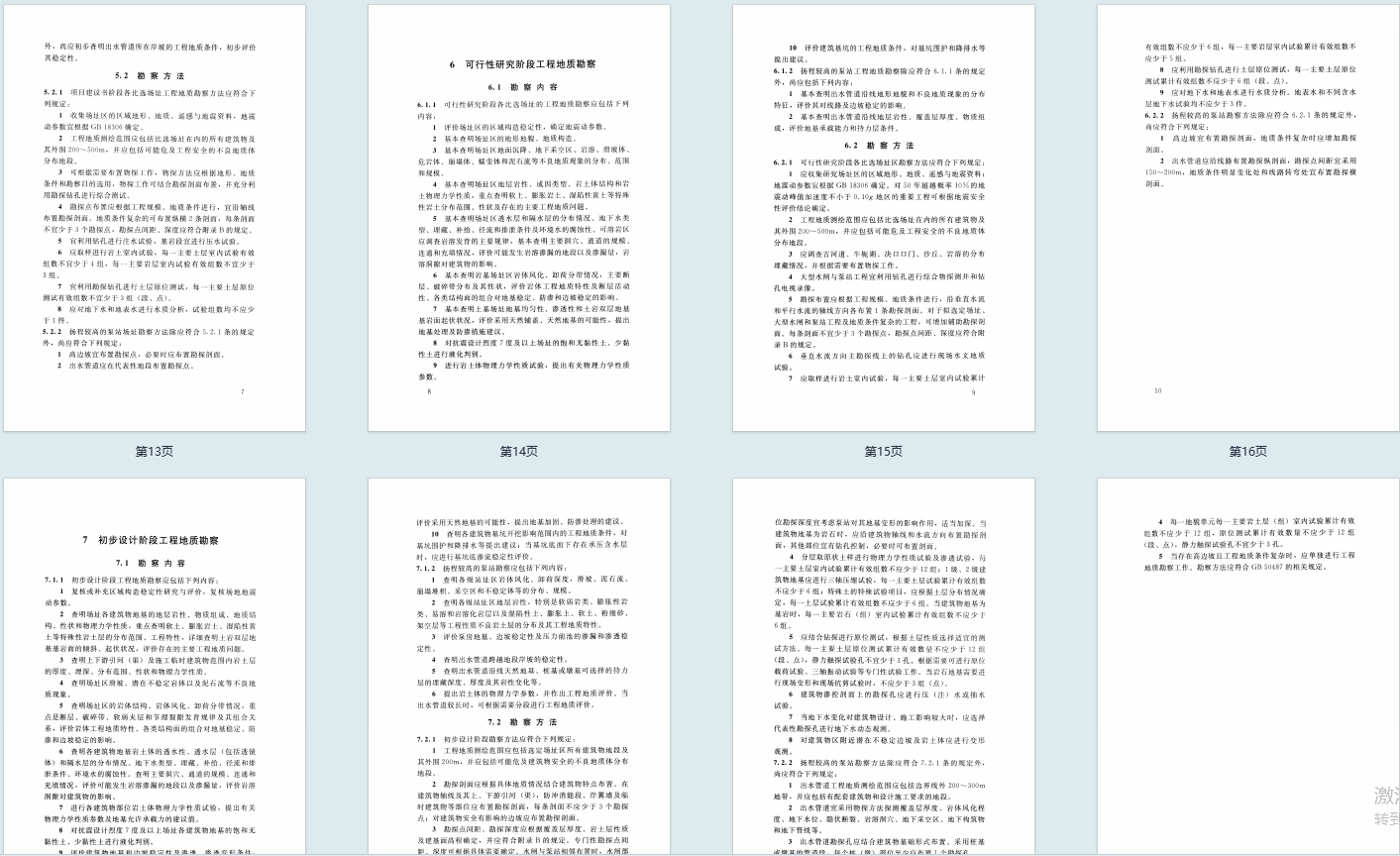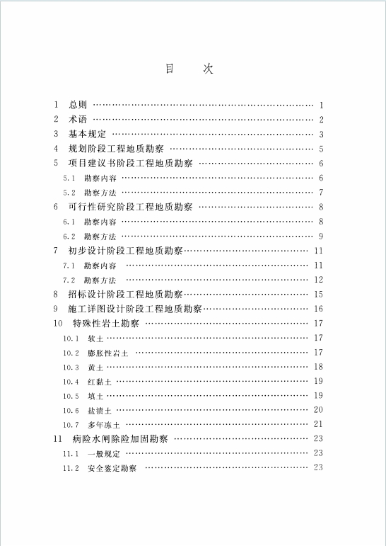 - 勘察方法:涵盖工程地质测绘、钻探、物探、原位测试(静力触探、标准贯入等)、室内试验,明确各方法的适用场景与精度要求。