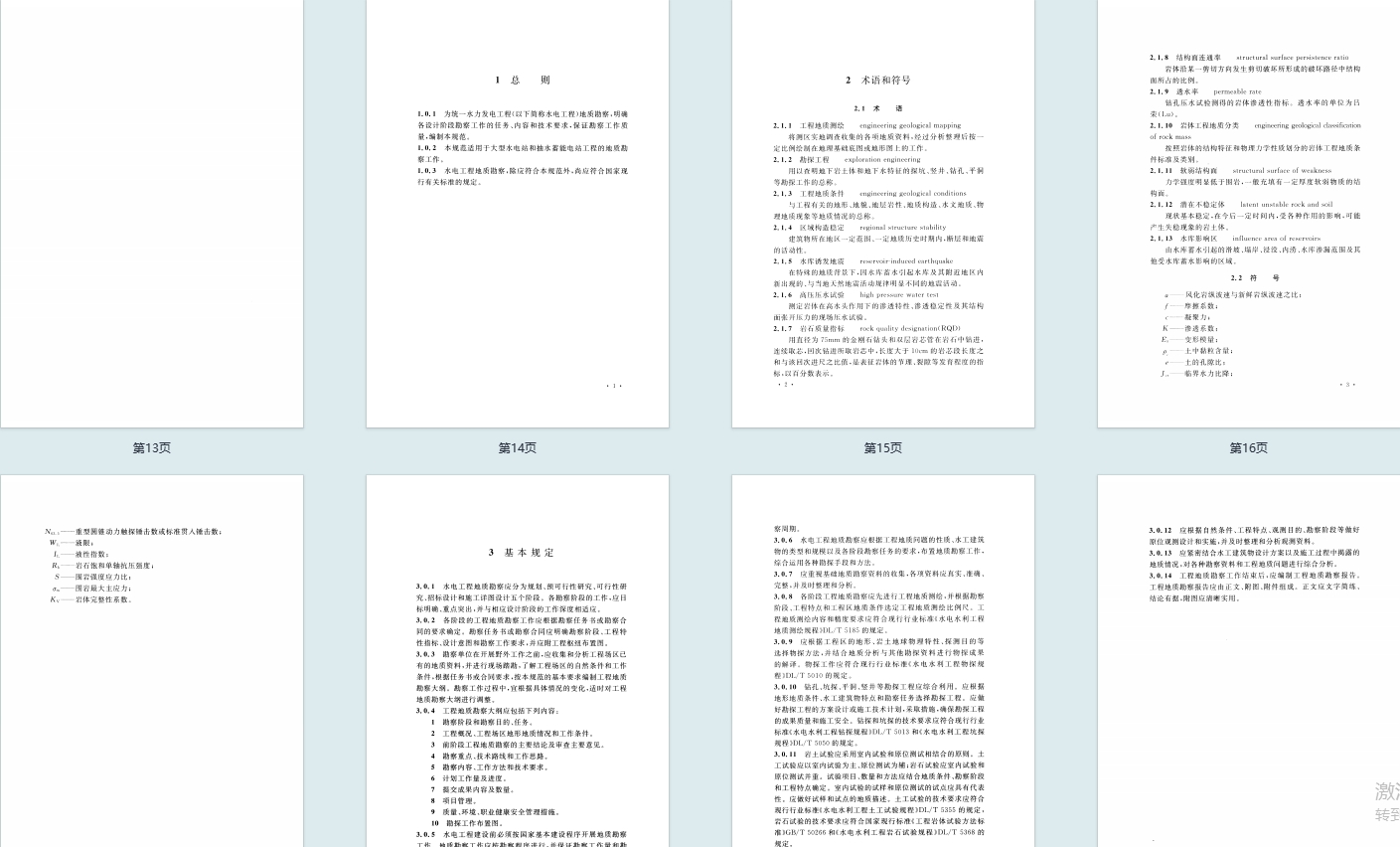 - 核心技术内容:涵盖总则、术语符号、基本规定,以及各阶段勘察要求,还包括抽水蓄能电站专项勘察内容。