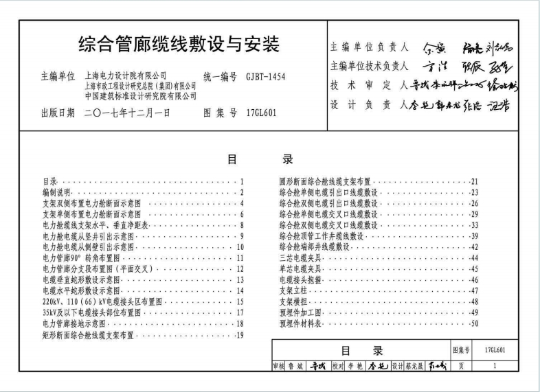 17GL601《综合管廊缆线敷设与安装》是国家建筑标准设计图集,适用于 220kV 及以下电力电缆及通信线缆在城市综合管廊内的敷设与安装设计、施工,核心是规范缆线敷设标准化流程与做法。