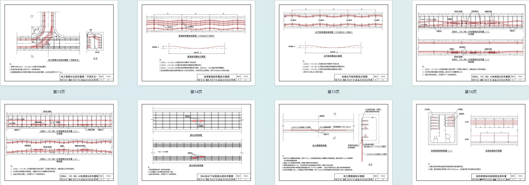 - 特殊区段处理:包含电缆引出口、交叉口、顶管工作井、端部井的敷设做法,明确转弯半径、引出口尺寸等要求;规定 220kV、110(66)kV 及 35kV 以下电缆接头区的布置方式,需设置刚性固定。