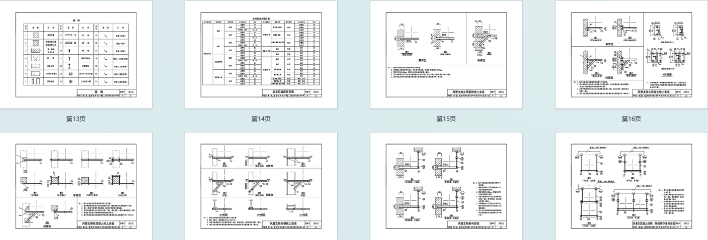 - 适用范围与编制依据:适配通风、空调、防排烟工程的风管支吊架,依据《通风与空调工程施工规范》等多项标准编制,风管长度限值、保温材料参数等有明确设定。