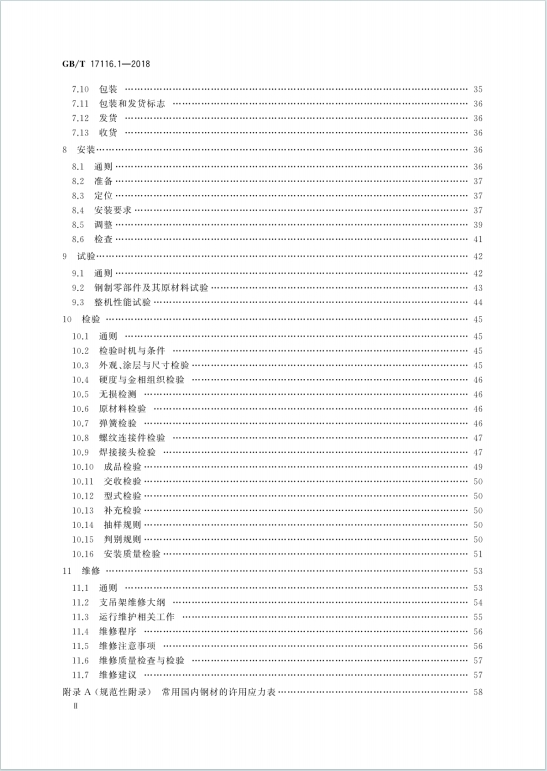 - 试验与检验:含零部件原材料试验(拉伸、冲击等)、整机性能试验(荷载偏差度、行程等),检验分工厂(工序、成品、型式检验)与安装(冷态 / 热态)两类,明确无损检测与判别规则。