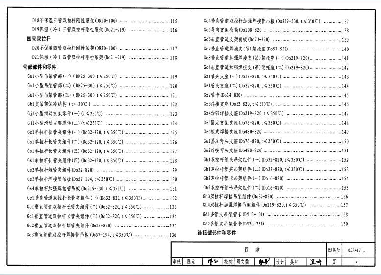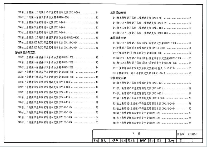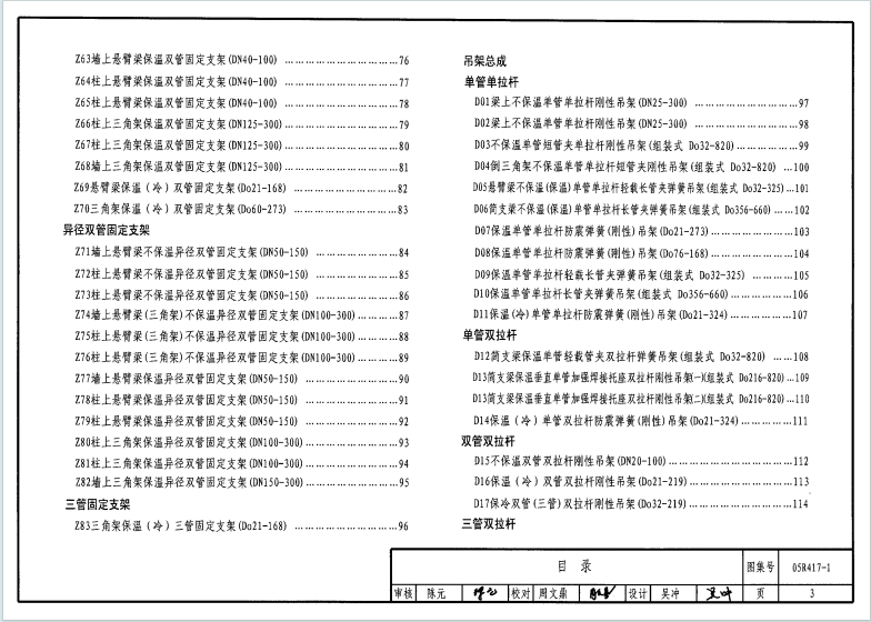 - 支架总成:含滑动支架(单管 / 双管 / 三管、保温 / 不保温、同径 / 异径)、固定支架(单管 / 双管 / 三管、保温 / 不保温、异径),覆盖 DN15~800 管径,明确安装间距、荷载及材料规格。