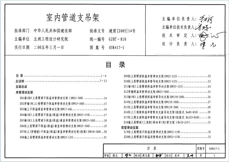 05R417-1《室内管道支吊架》是 2005 年实施的国家建筑标准设计图集,适用于民用与工业建筑室内多种介质管道(温度 – 20℃~350℃、公称直径 DN15~800)的支吊架设计、施工与选用,核心是提供标准化的支吊架类型、尺寸及安装方案。
