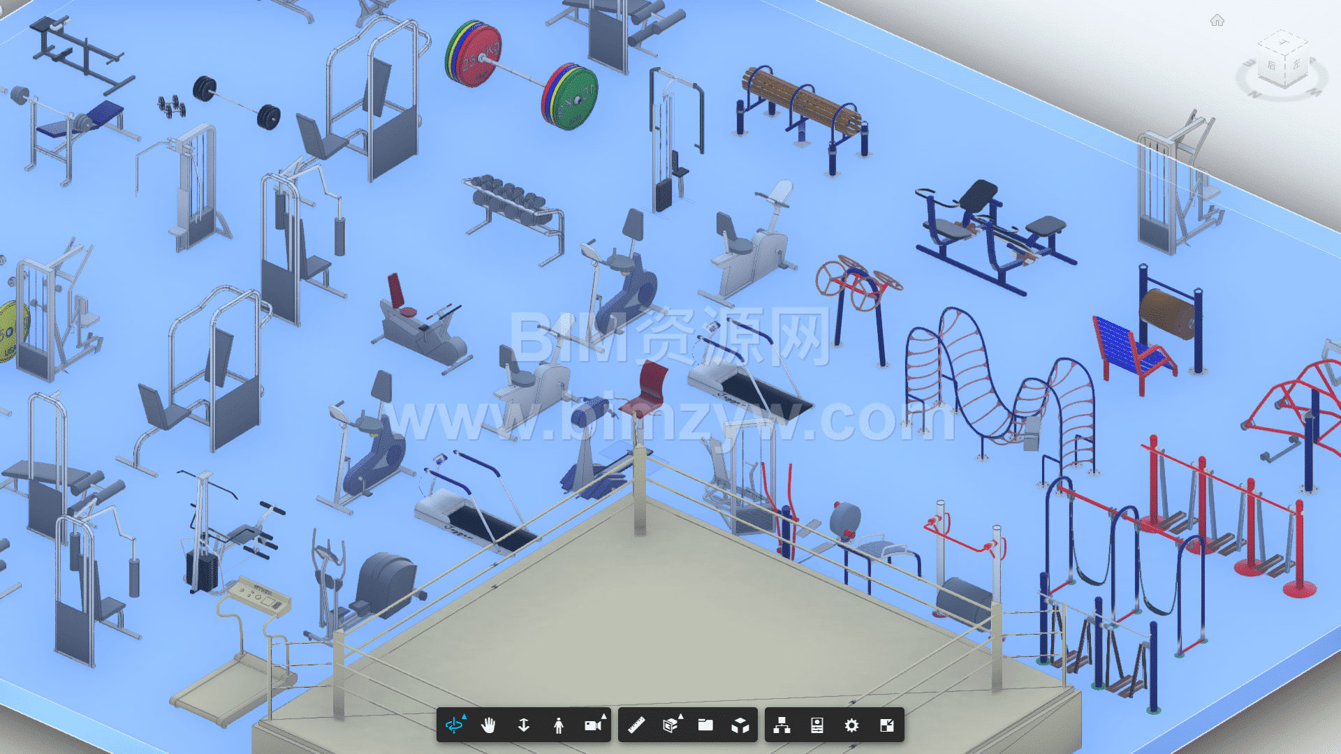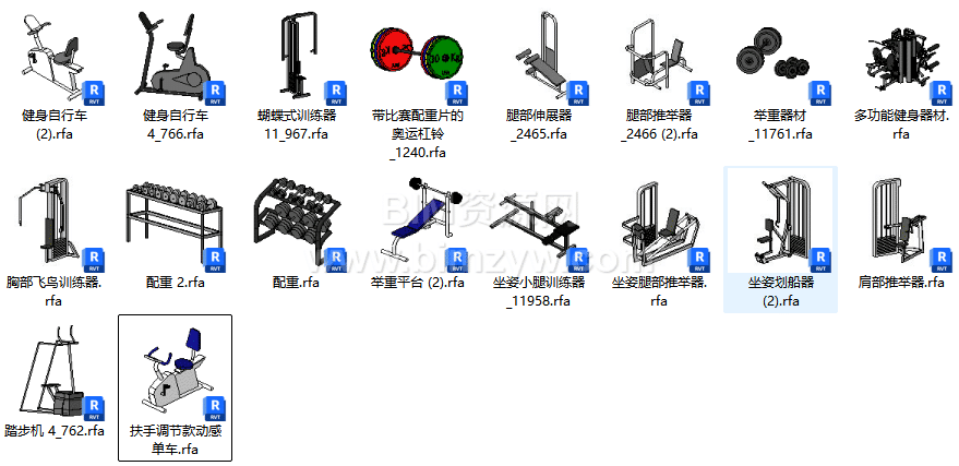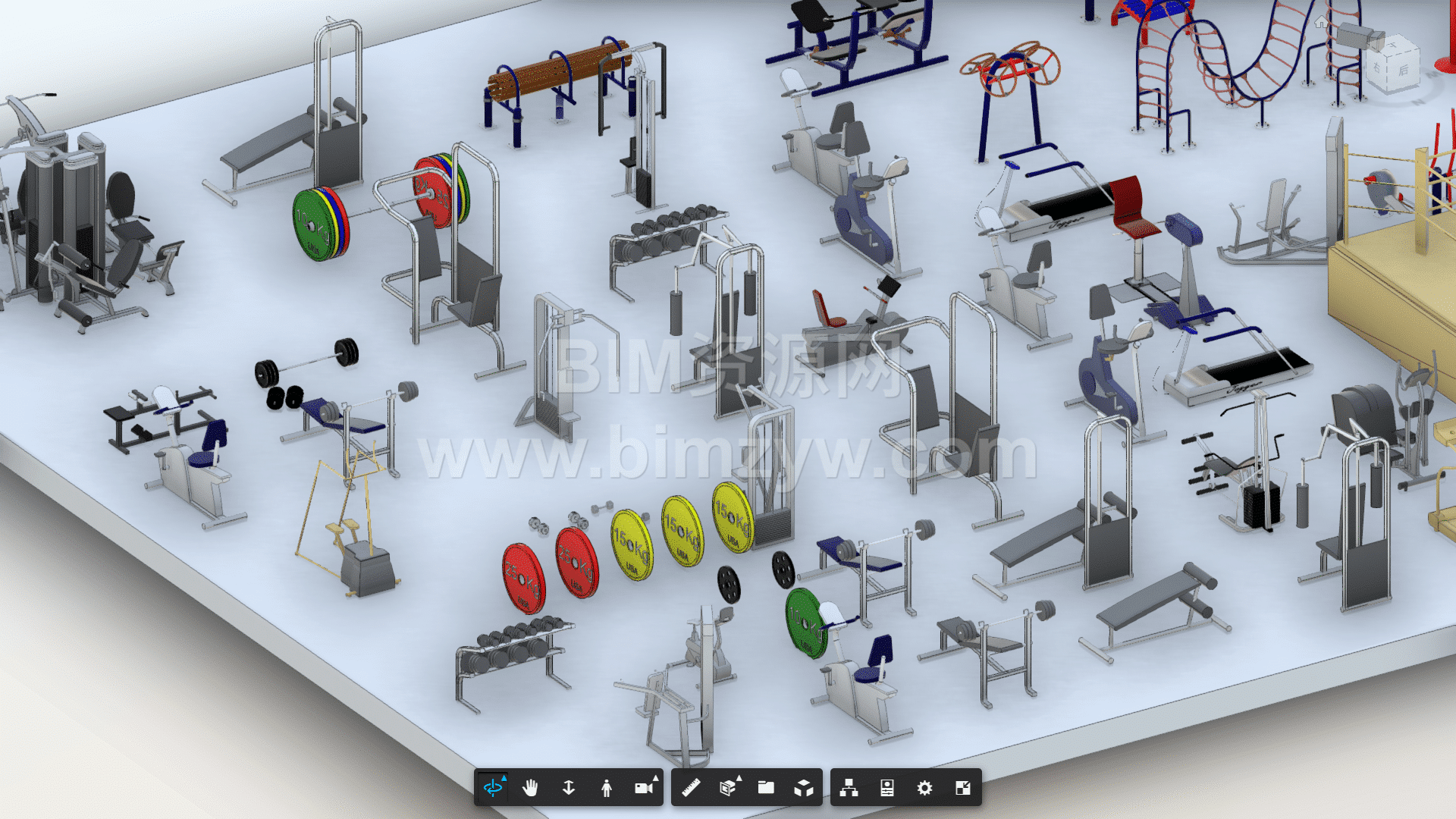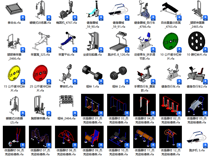 这套资源包含 58 个完整的 Revit 族组件,覆盖健身房核心锻炼场景所需的全品类器械:从有氧训练类的跑步机、动感单车,到力量训练类的深蹲架、胸部训练器、举重凳,再到辅助配件类的杠铃、杠铃扣、哑铃等,全面覆盖健身房日常锻炼的各类器械类型,每个族组件均为标准化建模,可直接嵌入 Revit 项目文件使用。