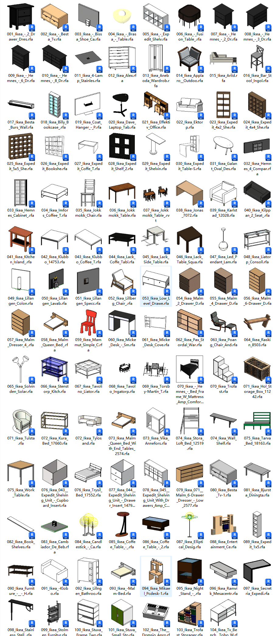 宜家是享誉全球的大型平价家具生产商,品牌家具凭借人性化的设计理念与百搭的风格调性,能够完美契合现代简约、轻奢、北欧、日式等各类主流室内装修风格,适配住宅、公寓、商业空间等不同的室内设计场景,是室内建模的优质素材。在本文中,您可直接下载整理齐全的宜家全系家具 Revit 专用族文件,品类规整且建模规范,可直接调用编辑。本次提供的适配 Revit 的宜家家具族具体分类包含:床族、柜族、椅子和扶手椅族、客厅家具族、沙发族、桌子族。