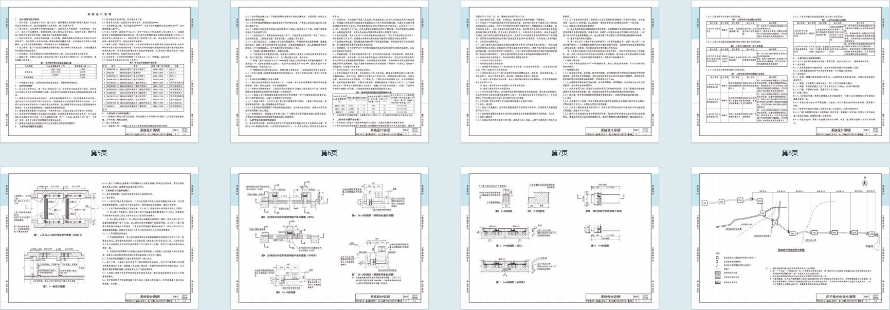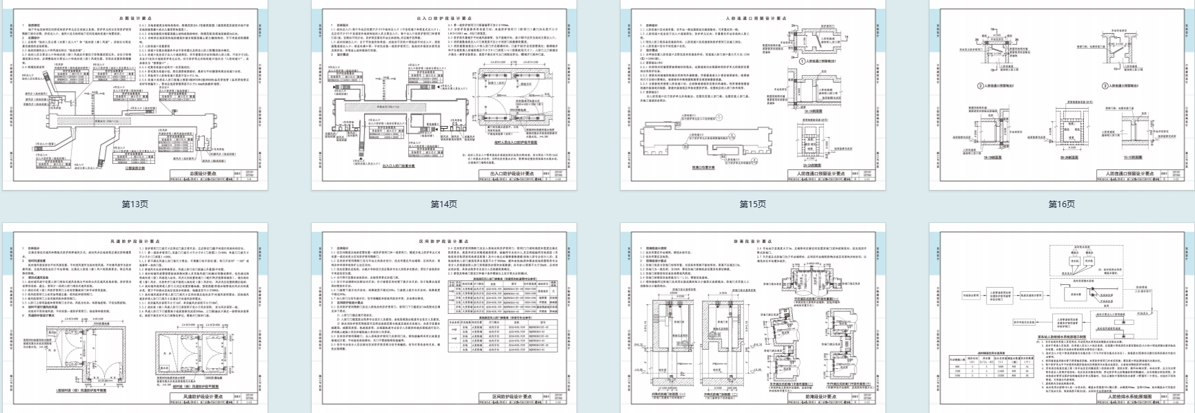 - 多专业设计要点:涵盖建筑(口部防护、伪装门设计)、结构(门框墙配筋、预埋件要求)、给排水(战时饮水 / 洗消储水、防爆地漏)、通风(清洁式 / 隔绝式通风)、电气(三级负荷供电、管线密闭敷设)等专业设计细则。