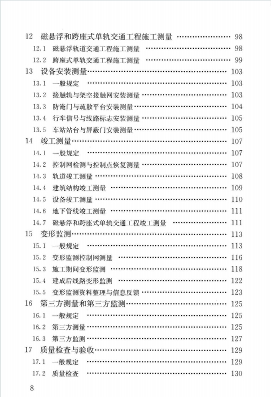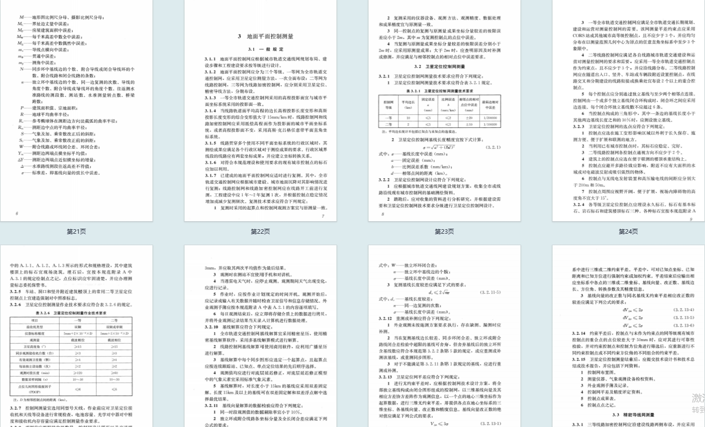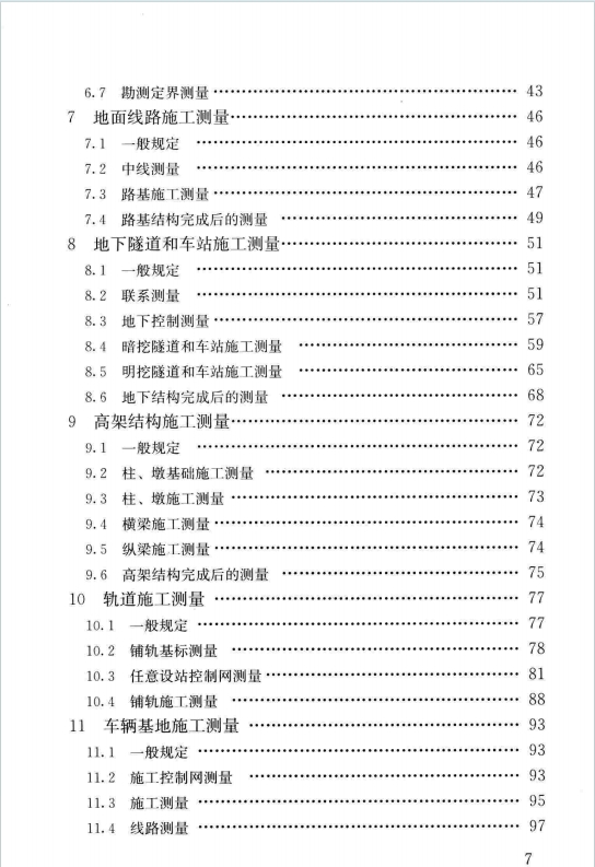 - 施工测量:涵盖地面线路、地下隧道和车站、高架结构、轨道、车辆基地、设备安装等场景的施工测量,明确不同工法的测量精度和流程。