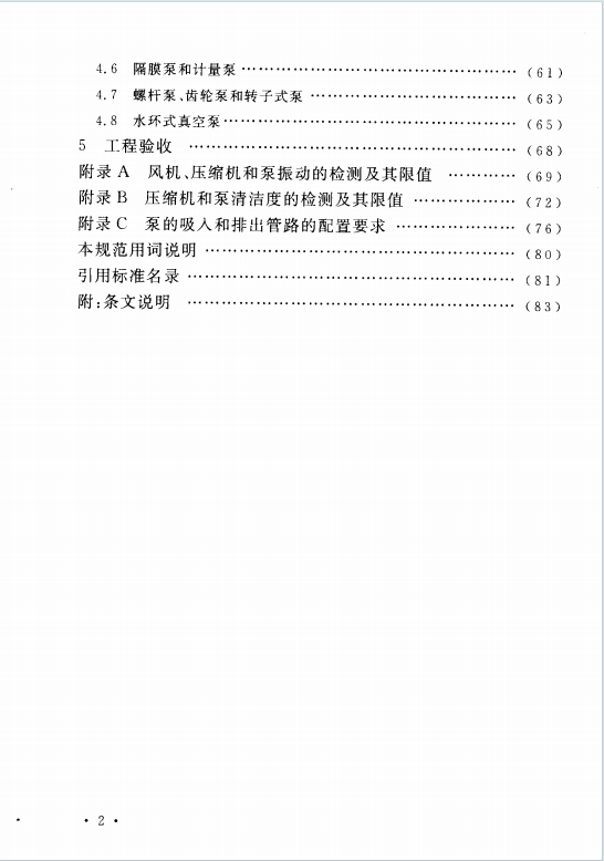 GB50275-2010《风机压缩机泵安装工程施工及验收规范》该规范是风机、压缩机、泵安装工程的国家标准,2011 年 2 月 1 日起实施,替代 GB 50275-98,适用于各类风机、压缩机、泵的安装施工及验收。