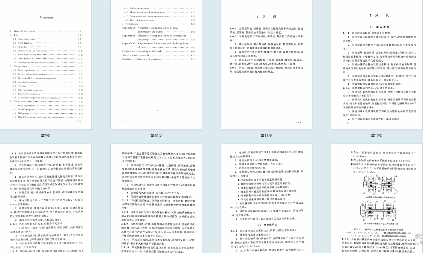 - 适用范围与基本要求:覆盖离心 / 轴流通风机、往复 / 螺杆 / 离心压缩机、离心 / 轴流 / 往复泵等多种设备,新增防爆通风机、消防排烟通风机、潜水泵等机型的安装要求;强调设备开箱检查、清洗、搬运吊装的通用规范,明确密封、润滑、冷却系统的严密性试验要求。