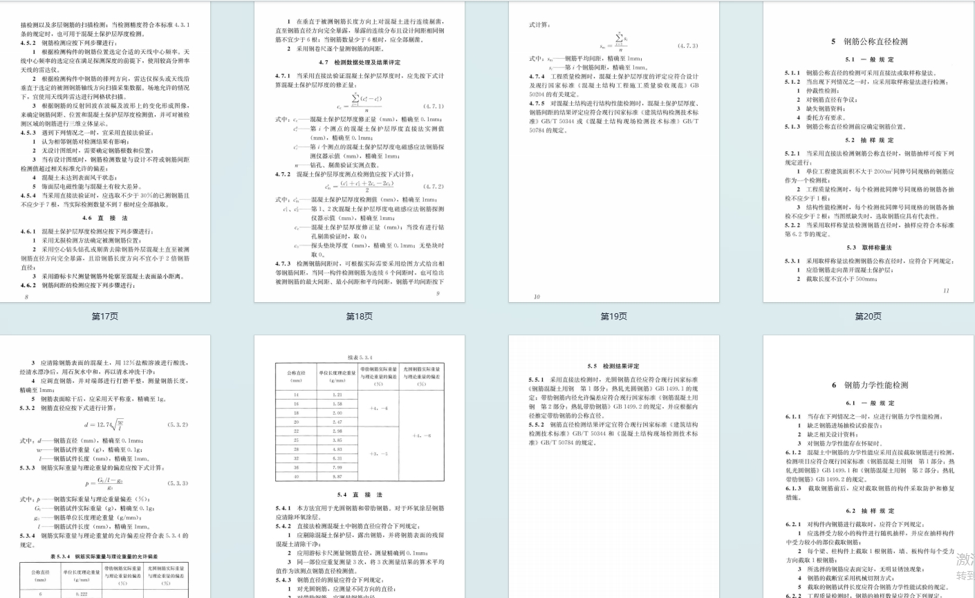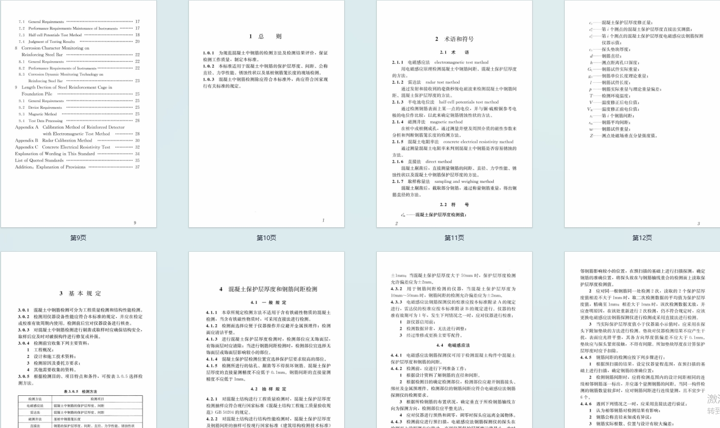 - 检测方法分无损检测(电磁感应法、雷达法、半电池电位法等)和直接法(剔凿 / 取样直接测量),优先采用无损检测,争议时以直接法验证。
