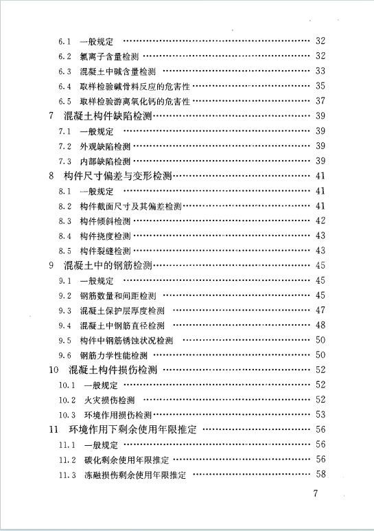 - 损伤与剩余使用年限:损伤检测含火灾、环境作用等类型,明确损伤状态分类与检测项目;剩余使用年限推定涵盖碳化、冻融损伤两类场景。