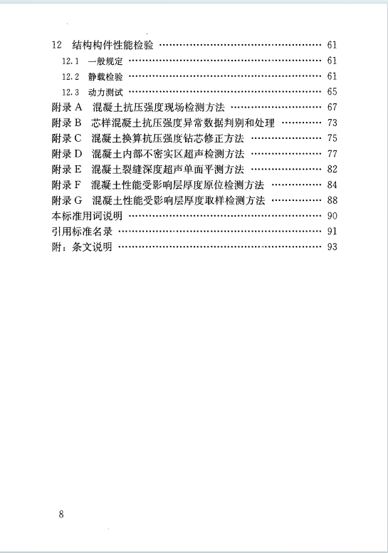 - 结构性能检验:含静载检验(适用性、安全性、承载力)和动力测试(自振频率、振型等),规定加载方式、观测项目及停止加载标志。