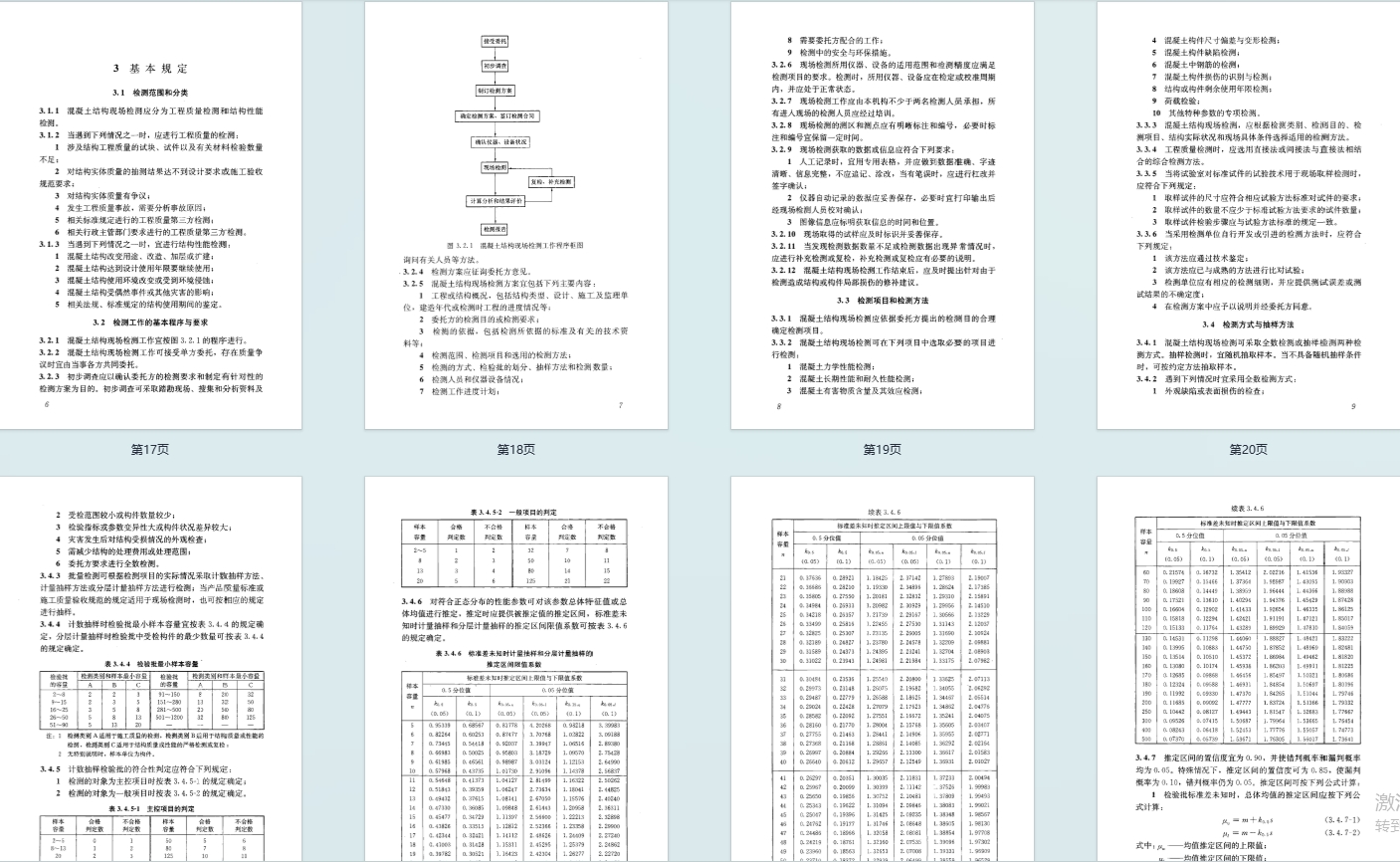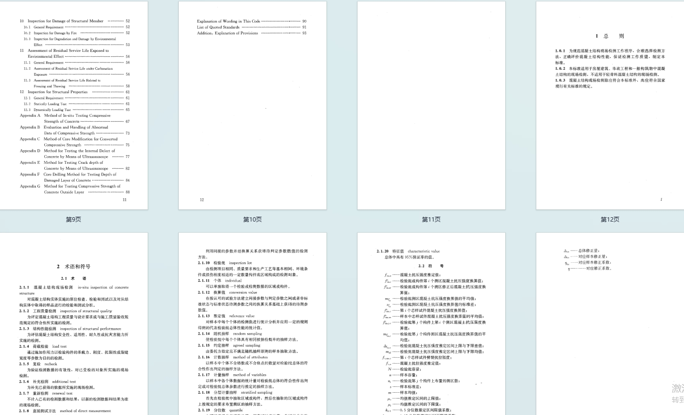 - 含混凝土抗压强度检测、芯样数据处理、裂缝深度超声检测、受影响层厚度检测等 7 个附录,提供具体操作方法与计算公式。