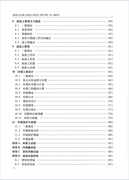 - 设备与环保要求:规范疏浚设备(耙吸、绞吸、抓斗等挖泥船)的选择依据、产量估算方法,明确设备适配土质与施工条件;强调环境保护与监测,规定污染土处置、悬浮物控制、噪声防治等措施,需制定环境监测计划。