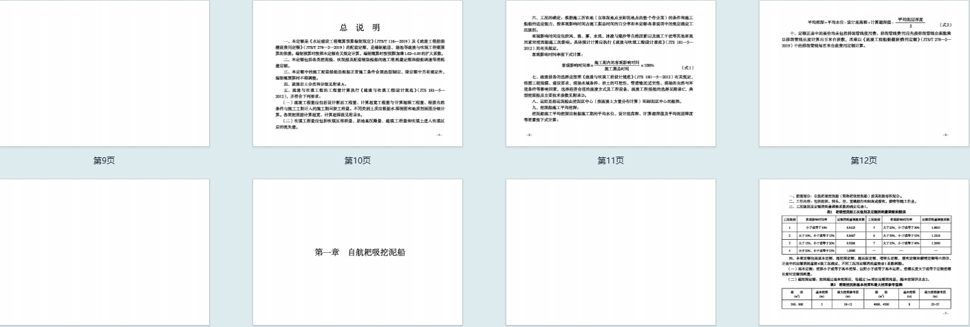 - 核心编制规则:明确疏浚岩土分类分级标准,统一工程量计算(含超宽超深、回淤量等);按客观影响时间率划分工况级别,规定不同工况的定额消耗量调整系数;明确各类船舶的基本挖深、最大挖深、运距等参数及超挖深、超运距的定额调整方式。