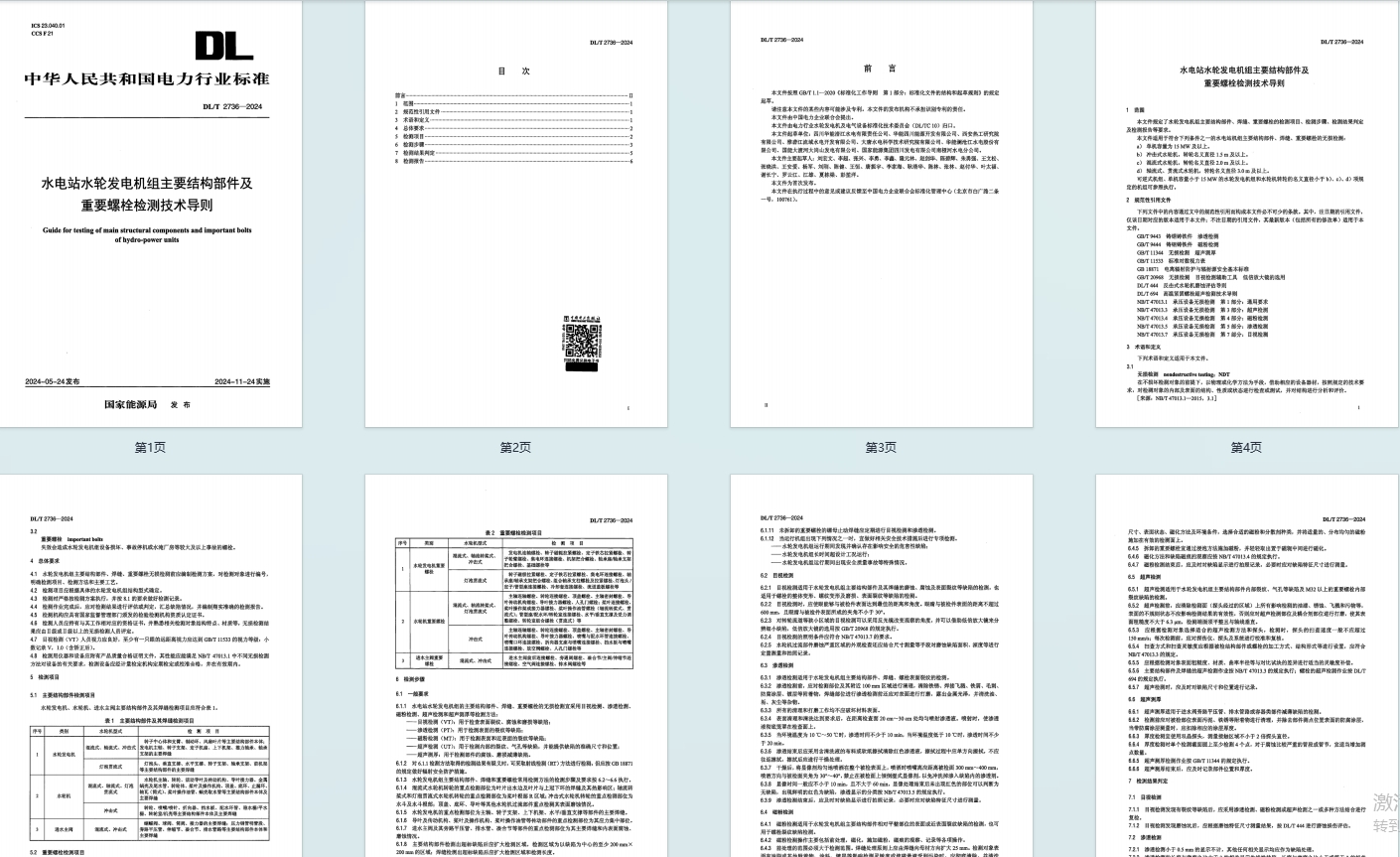 DL/T 2736-2024《水电站水轮发电机组主要结构部件及重要螺栓检测技术导则》于 2024 年 5 月 24 日发布、2024 年 11 月 24 日实施,为首次发布。