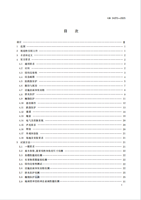 GB34272-2025《小型游乐设施安全规范》于 2025 年 10 月 31 日发布、2026 年 5 月 1 日实施,替代旧版标准。其适用于 3-14 周岁儿童在公共场所使用的小型游乐设施,不适用于健身器材、体育器材和家用活动玩具。