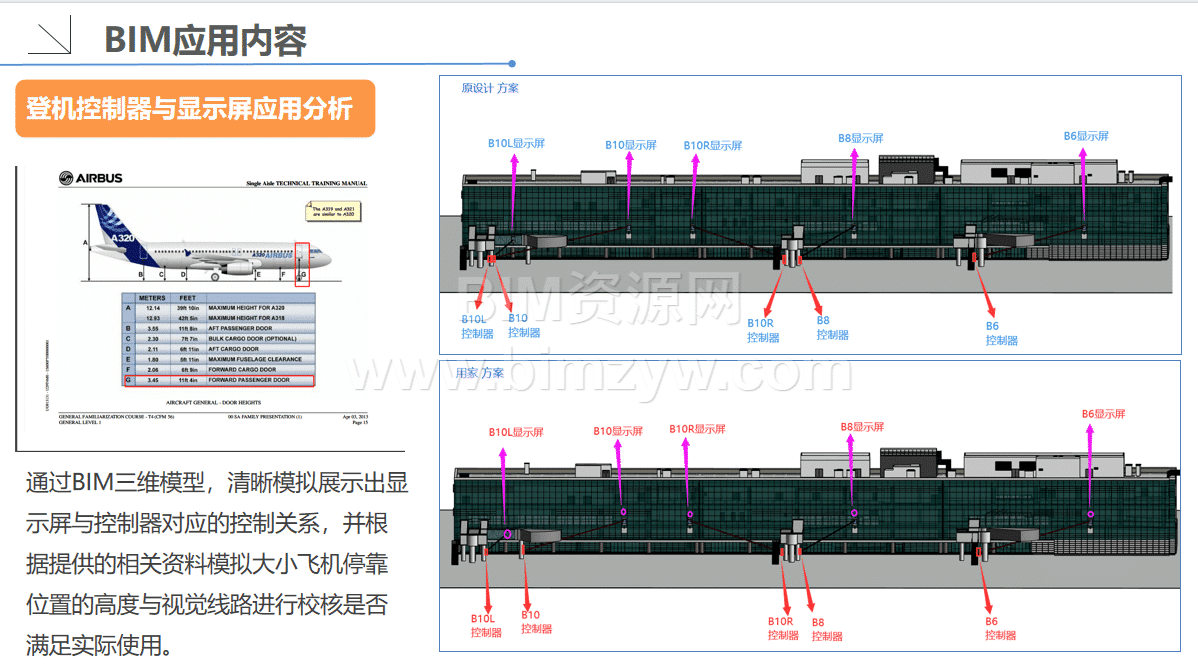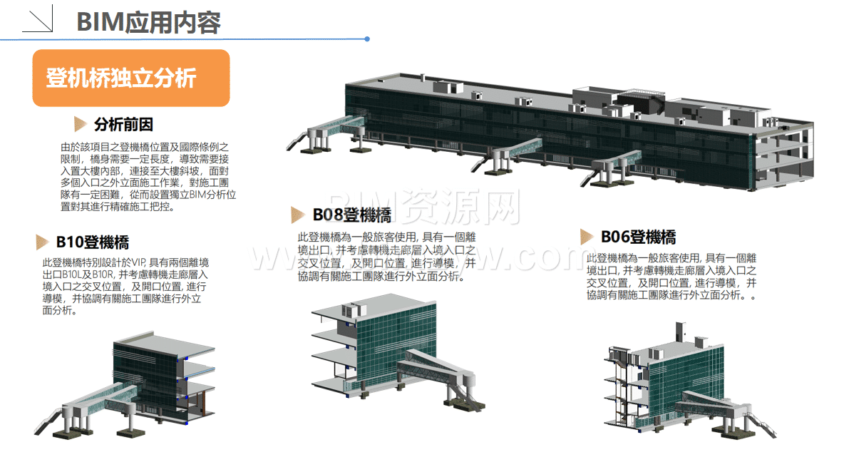 - 专项方案分析:针对登机桥这一核心设施,进行独立 BIM 建模分析,考虑其与大楼斜坡、多入口外立面的衔接关系,协调施工团队优化施工方案,精准把控安装精度,满足国际条例对登机桥长度、接口的要求。