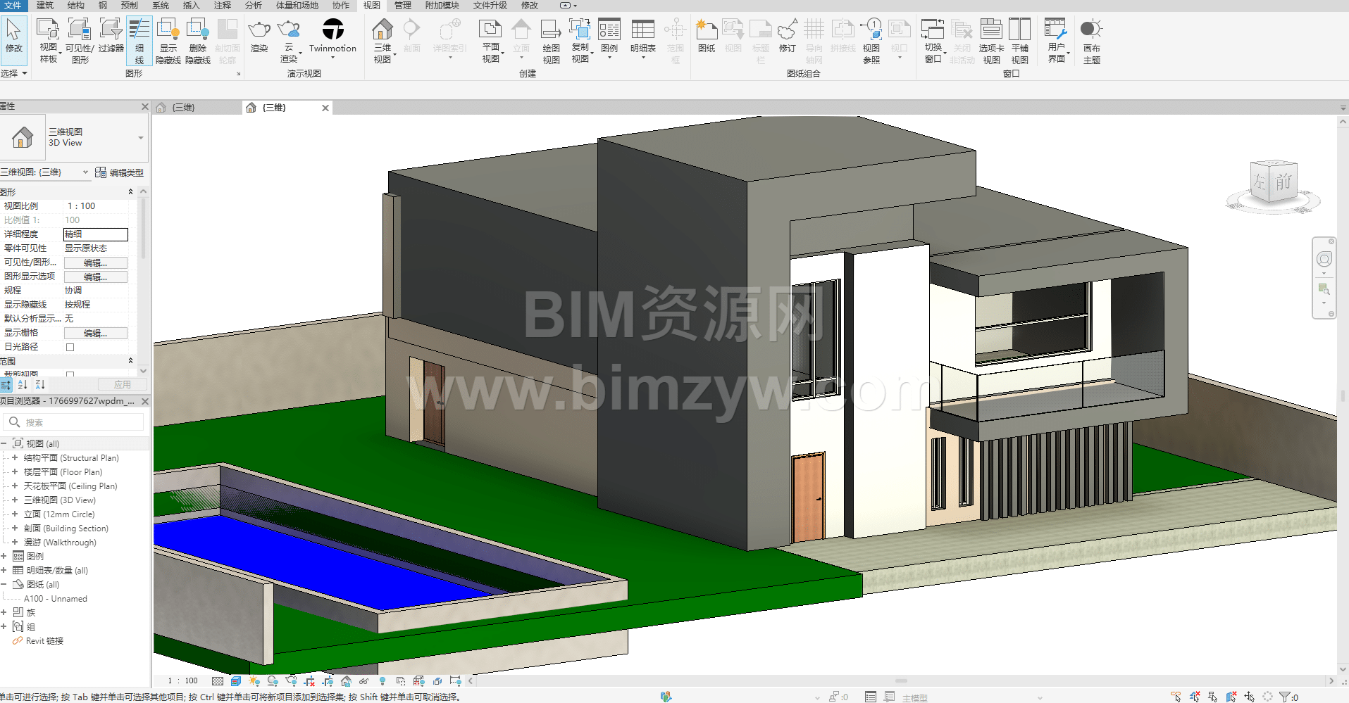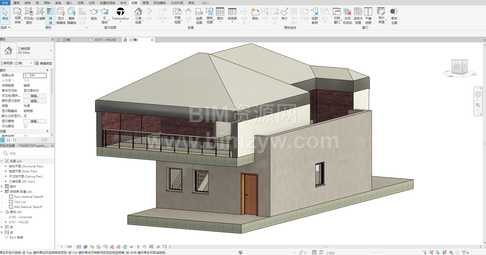 一个现代两层住宅的BIM模型项目,其特点是带有周边栏杆的平屋顶露台、一个小型悬挑阳台和明确的入口台阶,非常适合住宅概念设计和协调工作。