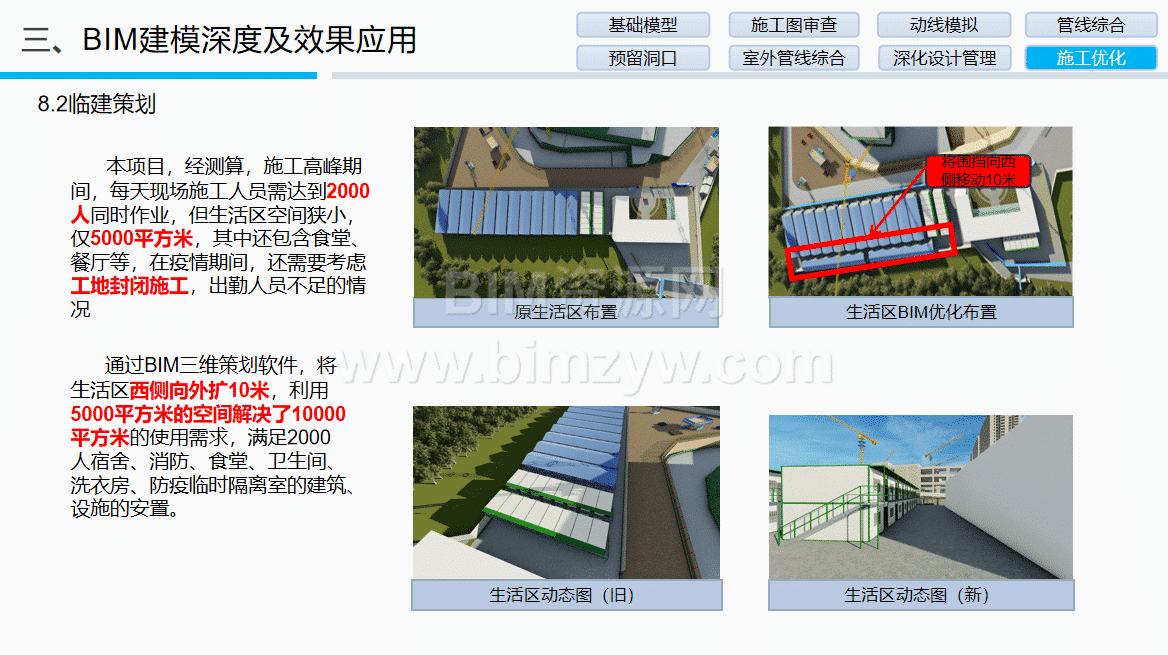 动态场地与交通策划:利用BIM软件模拟不同施工阶段的场地布置,将生活区向西外扩10米,在5000平方米空间内满足2000人住宿、食堂、防疫隔离等需求;针对基坑周边红线狭窄的问题,设计“C”型环场道路,满足施工车辆通行与消防要求。