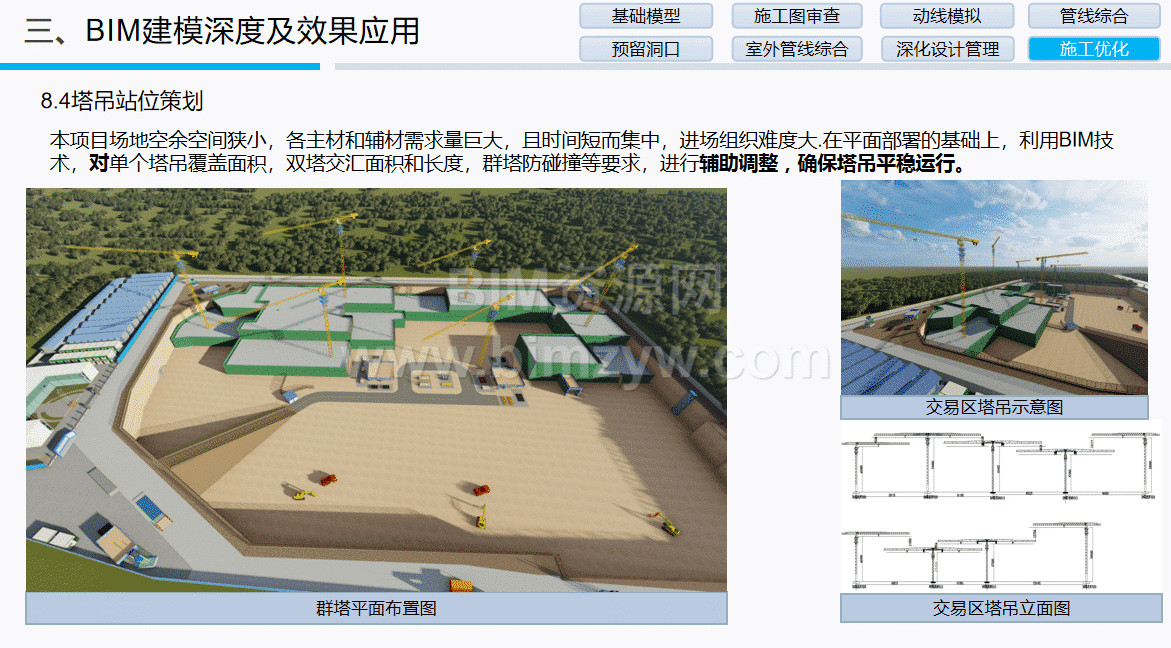 砌体与临建精细化:利用BIM砌体排布软件生成二次结构排砖图,明确构造柱、过梁位置与砌块规格,降低材料损耗,提高砌筑效率;通过BIM三维策划优化塔吊站位,确保群塔覆盖无死角,同时满足防碰撞要求。