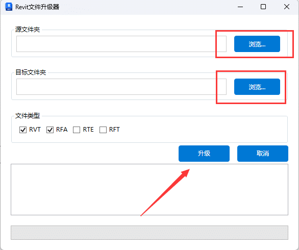 7、插件使用起来也很方便,源文件夹就是你要升级的Revit文件所在目录,目标文件夹是升级后的文件放置位置,两种文件分开放置,不会丢失源文件,也方便管理