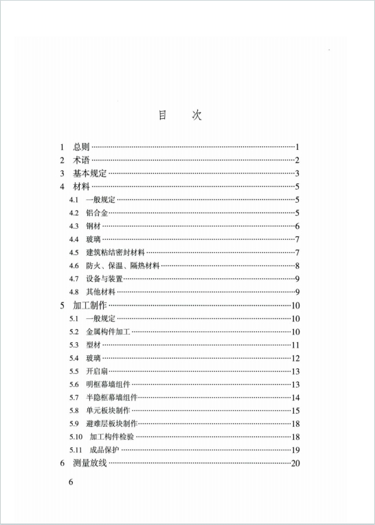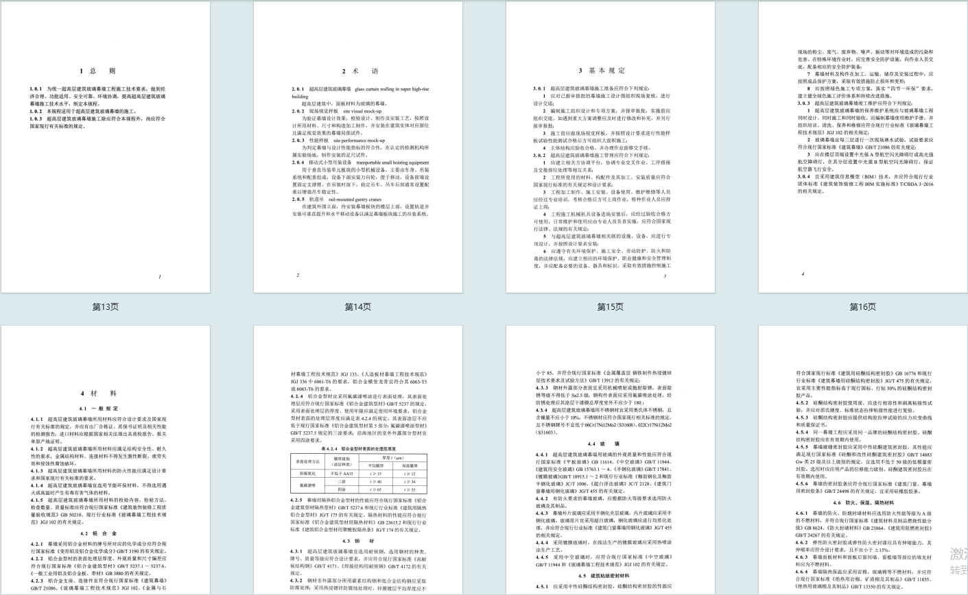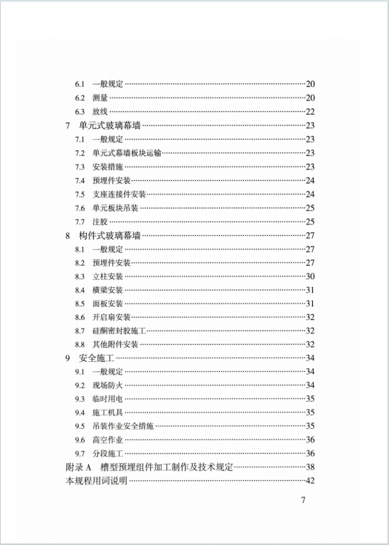 - 涵盖总则、术语、基本规定、材料、加工制作、测量放线、单元式与构件式玻璃幕墙施工、安全施工等 9 大核心章节。