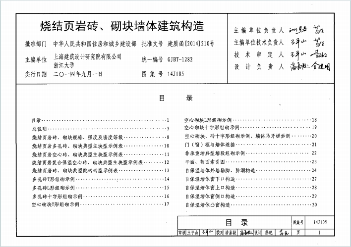 《14J105 烧结页岩砖、砌块墙体建筑构造》是 2014 年 9 月 1 日实施的国家建筑标准设计图集,由住房和城乡建设部批准,上海建筑设计研究院有限公司、浙江大学主编。
