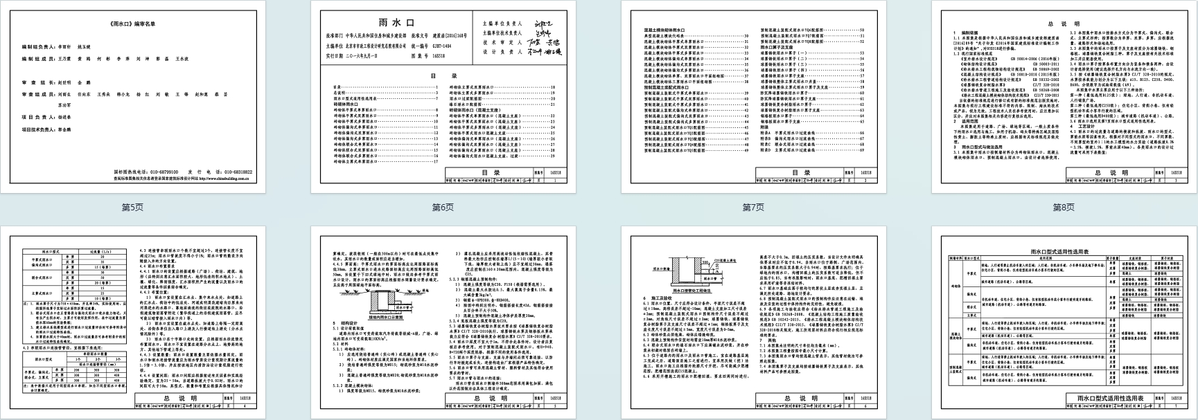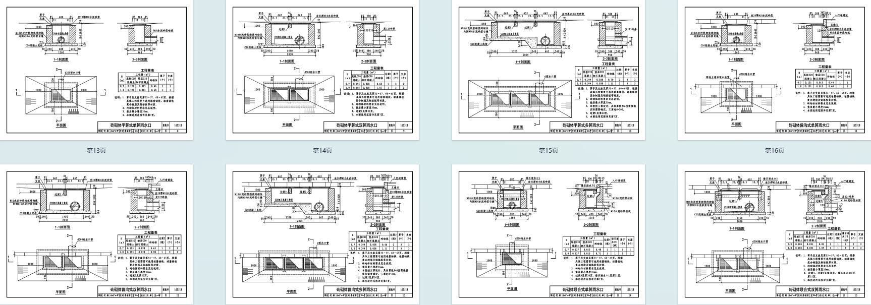 - 包含各类雨水口的构造详图、配筋图、过流曲线图,同时规定了施工验收的尺寸误差、材料要求、回填压实等标准。