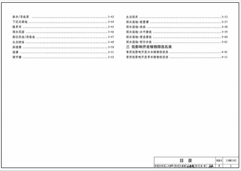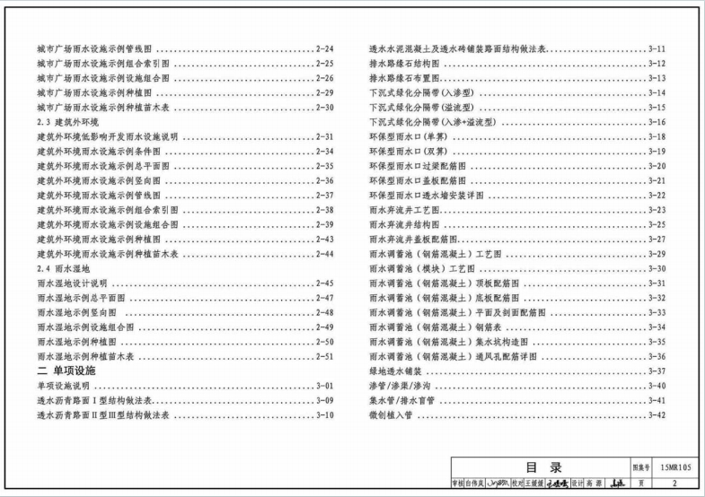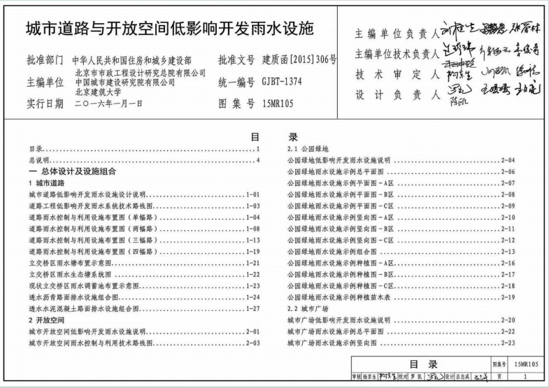 15MR105《城市道路与开放空间低影响开发雨水设施》是海绵城市建设系列国家建筑标准设计图集,2016 年 1 月 1 日起实施,适用于新建、改建、扩建的城市道路与开放空间(公园绿地、城市广场、建筑外环境、雨水湿地)的低影响开发雨水控制与利用工程,为相关设计、施工人员提供标准化指导。