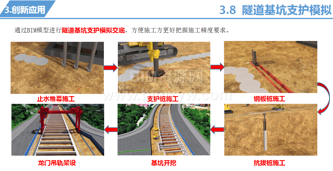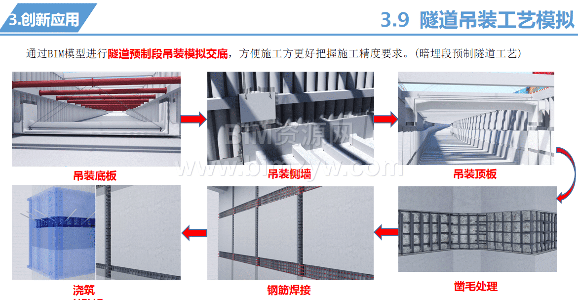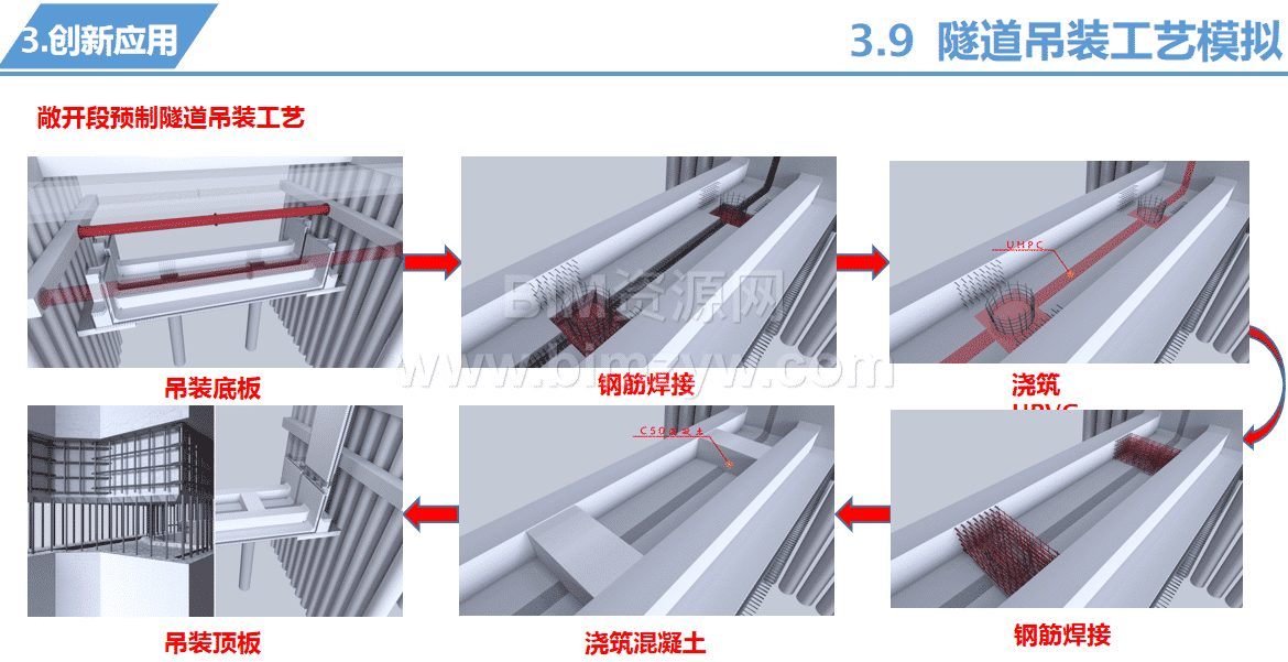 - 施工工艺模拟:针对隧道装配式施工的核心痛点,借助 BIM 技术开展基坑支护模拟、预制构件吊装模拟,清晰展示吊装底板、侧墙、顶板等关键工序流程。同时,通过模型可视化交底后浇带防水、隧道排水等复杂工艺,确保施工人员精准把控技术要点,保障工程质量。