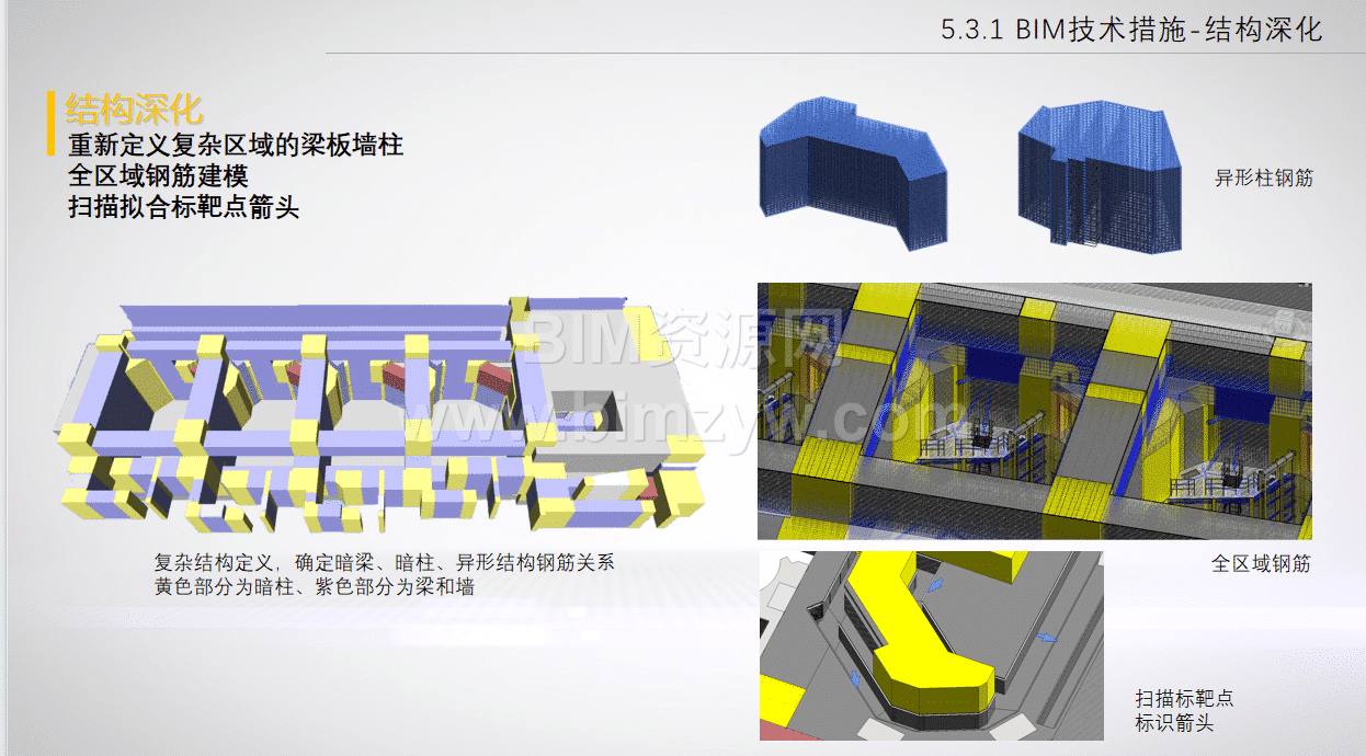 全区域钢筋建模:在 BIM模型 中精确重构复杂区域的梁、板、墙、柱及暗梁暗柱,确定异形结构钢筋关系 。