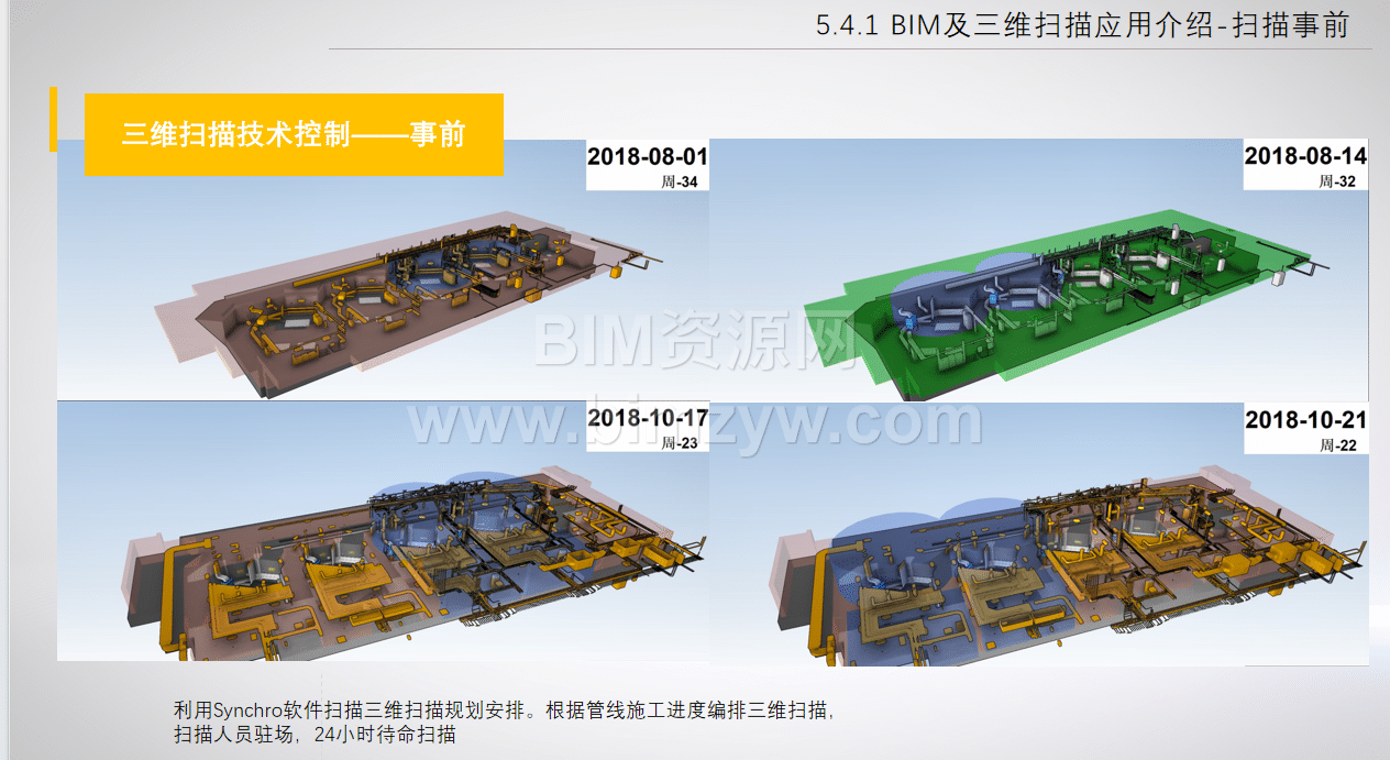 扫描事前规划:利用 Synchro 编排扫描计划,扫描人员驻场 24 小时待命,确保配合施工进度 。