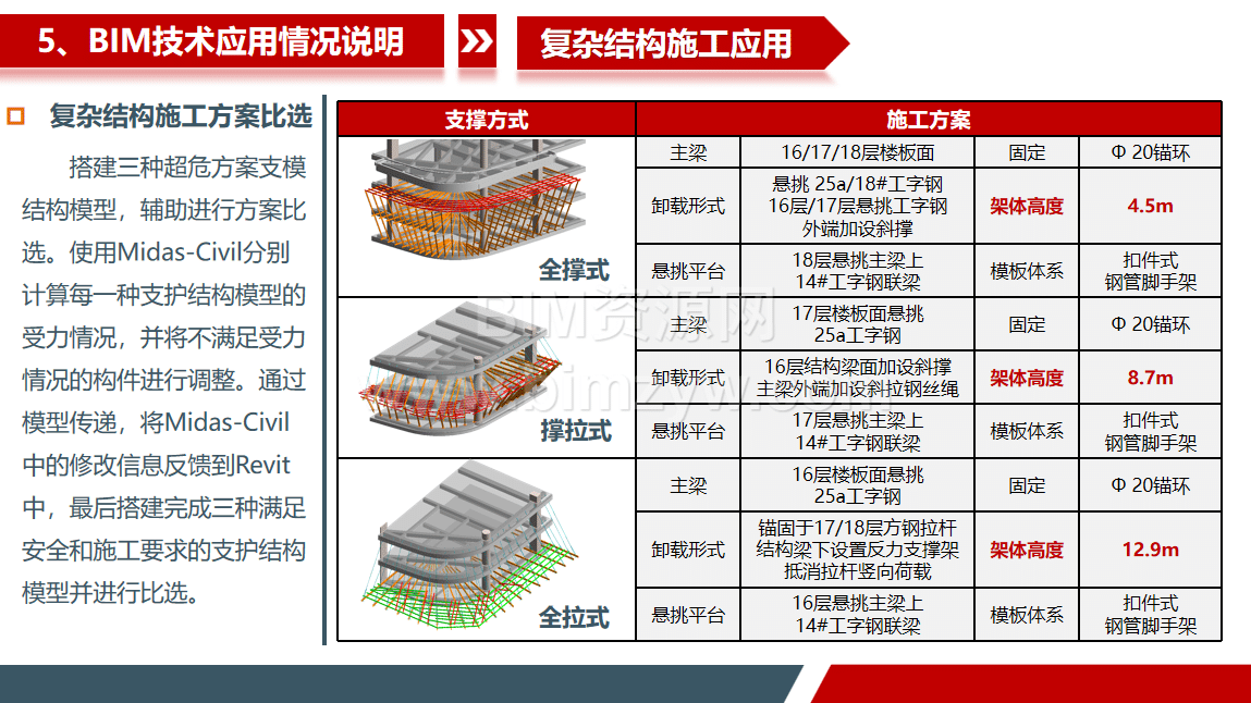 项目打造高精度金融中心 T3 BIM 模型,涵盖建筑、结构、机电等全专业,形成可直接指导施工的 BIM 模型成品。依托 Revit、Navisworks 等软硬件工具,开展碰撞检查、管线优化、复杂节点深化等核心 BIM 应用,累计发现并解决碰撞问题 2164 处,优化各类施工难题超 600 处,创造直接经济效益 856 万元,缩短工期 76 天。针对 19 层最大悬挑 4.36m 的双曲弧形露台等重难点,通过 BIM 模型进行方案比选与施工模拟,确定全拉式支模方案,保障施工安全与质量。