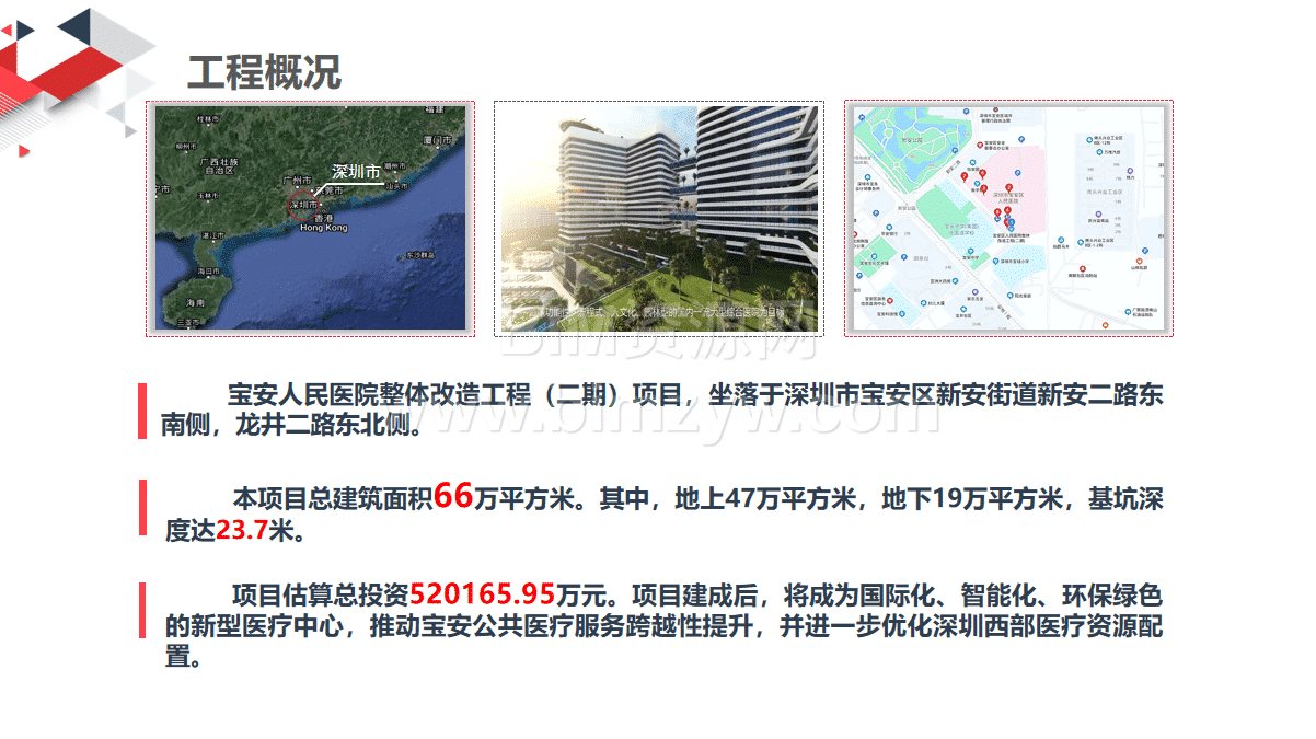 本项目总建筑面积66万平方米。其中,地上47万平方米,地下19万平方米,基坑深度达23.7米。A栋裙房7层,B栋裙房6层,1至4号塔楼23层,6号塔楼31层。项目估算总投资520165.95万元。