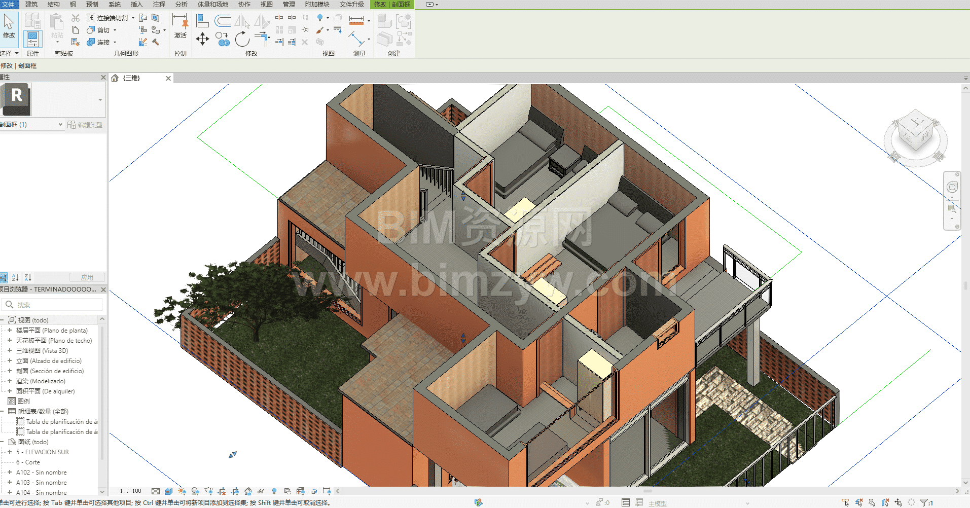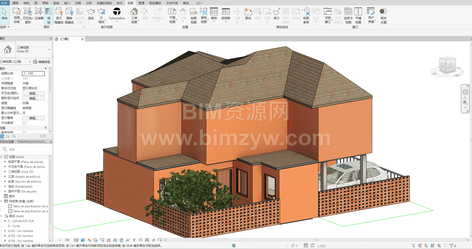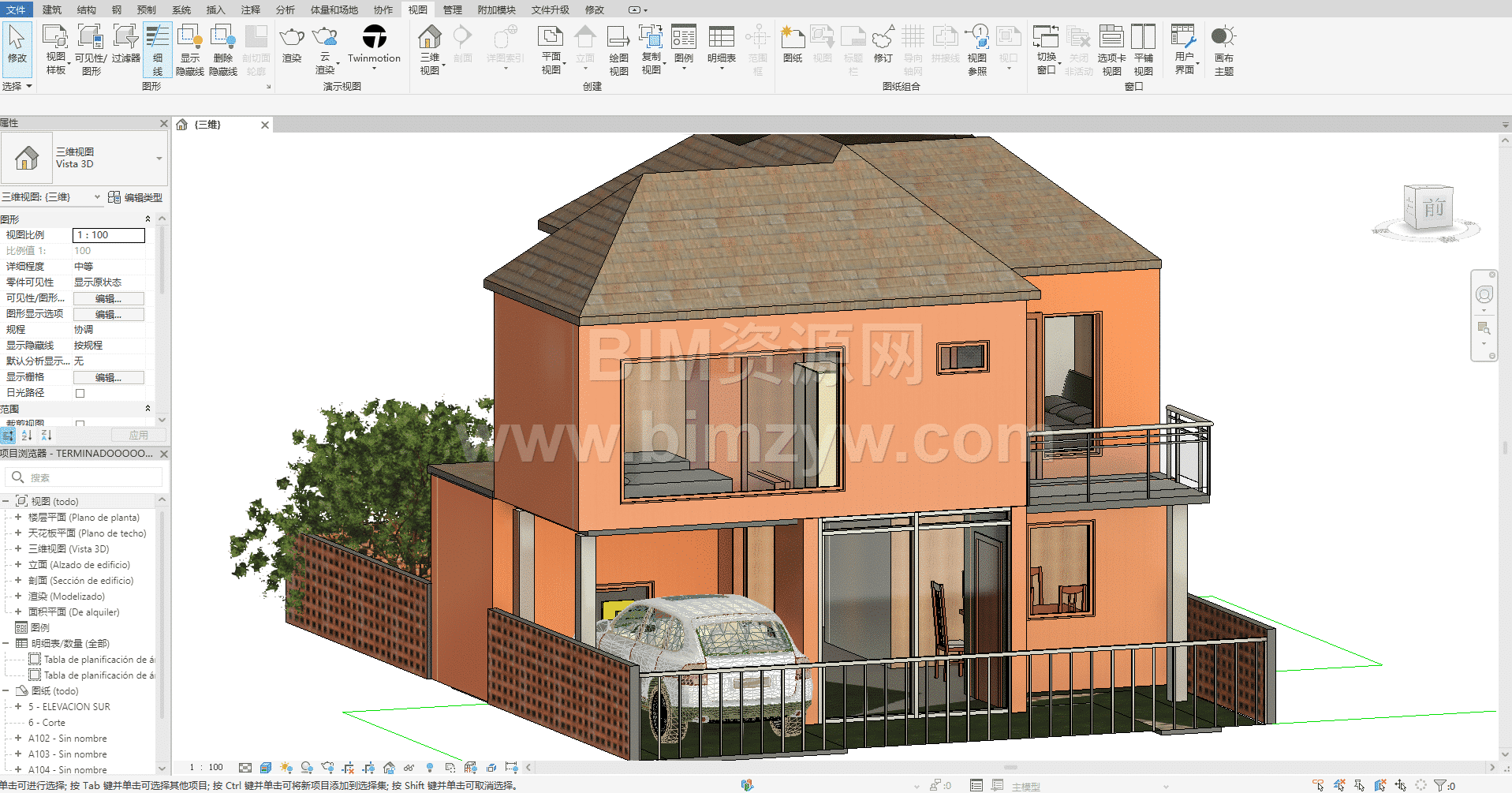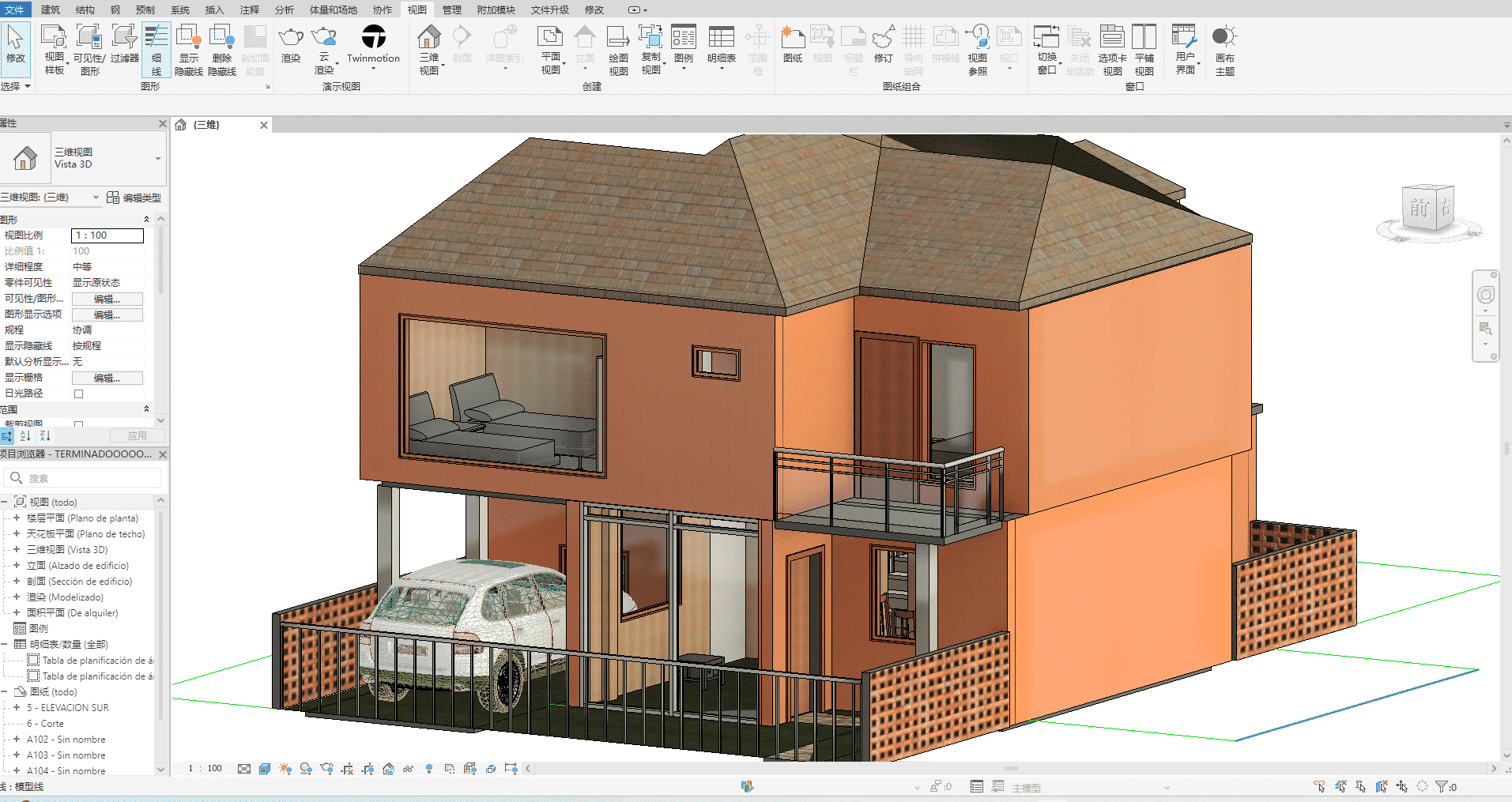 这是一套两层住宅楼精装 BIM 三维模型:建筑采用暖橙色外立面搭配深棕色错落坡屋顶,一层为架空停车区与入户过渡空间,区域内停放汽车模型并环绕镂空砖墙围栏;二层为起居与卧室功能区,透过大窗与玻璃阳台可直观看到床、沙发等完整家具布局,模型内部软装陈设一应俱全,是完整的房建类 BIM 设计资源。