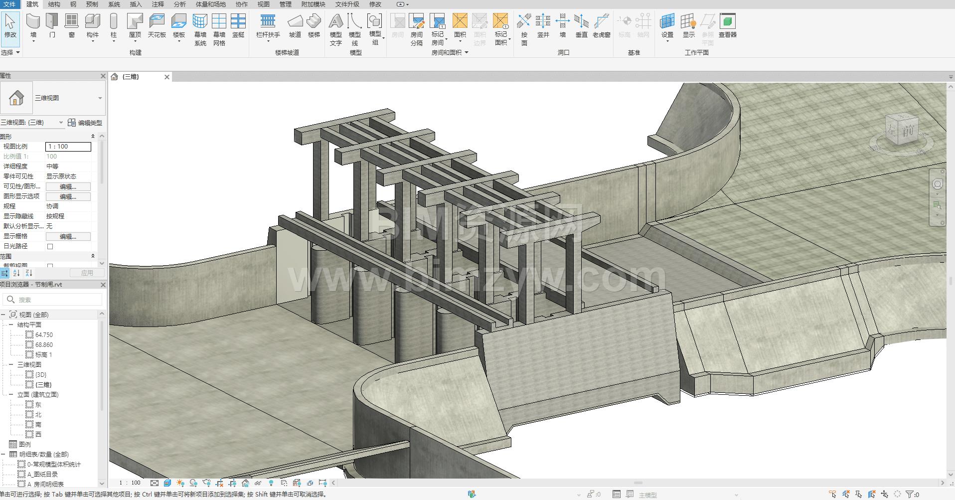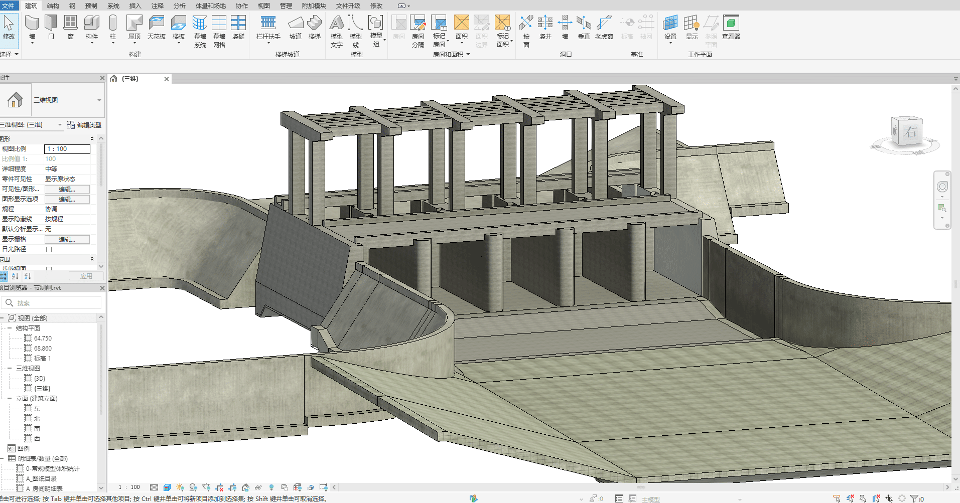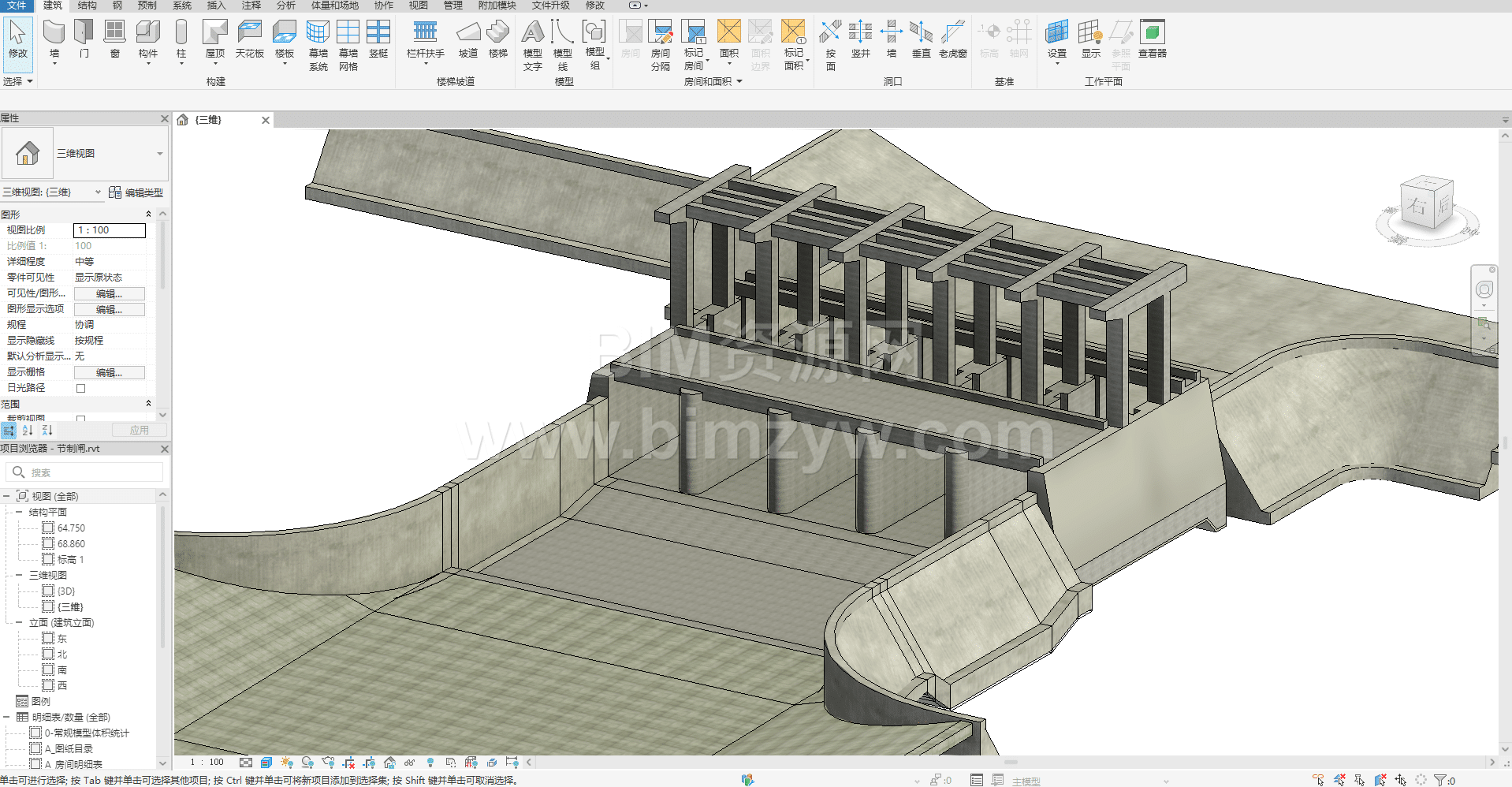 节制闸是水利工程中最常见的水工建筑物之一,这类 Revit BIM 模型在水利行业数字化转型中,广泛应用于河道治理、灌区改造、防洪排涝等工程场景,是水利工程 BIM 正向设计的典型实践案例。本套资源为完整的节制闸 BIM 成品模型,包含全构件参数化信息,是水利 BIM 从业者与爱好者的优质学习参考素材。